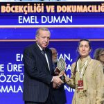 Hatay’da 7 yıl boyunca arayarak bulduğu ‘Hatay Sarısı’ cinsi ipek böceklerini yaşatmak için ömrünü adayan Emel Duman’a Cumhurbaşkanı Recep Tayyip Erdoğan tarafından “Yaşayan İnsan Hazinesi” ödülü verildi.