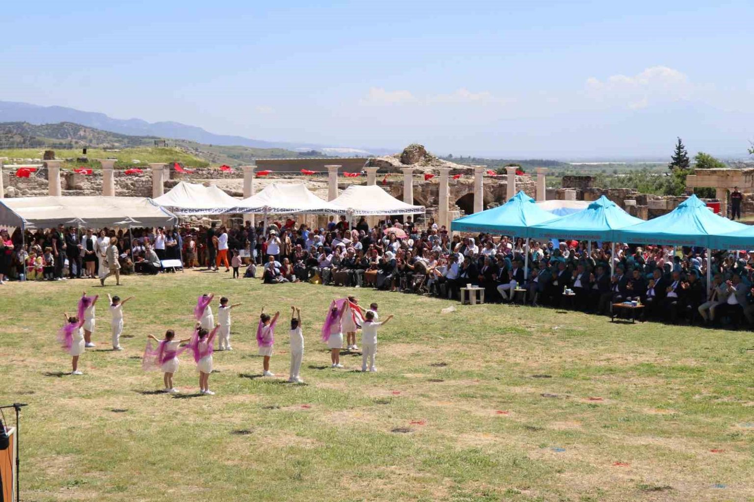 Denizli’nin Buldan ilçesine bağlı Yenicekent Mahallesi’nde yer alan okullar, Türkiye’de eşine az rastlanır bir bayram kutlamasına imza attı. 23 Nisan günü yapılması planlanan ancak sağanak yağış ve olumsuz hava şartları nedeniyle bugüne (29 Nisan) ertelenen etkinliklerin adresi, Tripolis Antik Kenti oldu. Yenicekent’teki ilk ve ortaokul öğrencilerinin aylar süren hazırlıkları, antik kentin kalbi sayılan Agora’da hayat buldu. Binlerce yıllık sütunların ve tarihi dokunun arasında sergilenen halk oyunları, modern dans gösterileri ve şiir konserleri izleyenleri etkiledi.