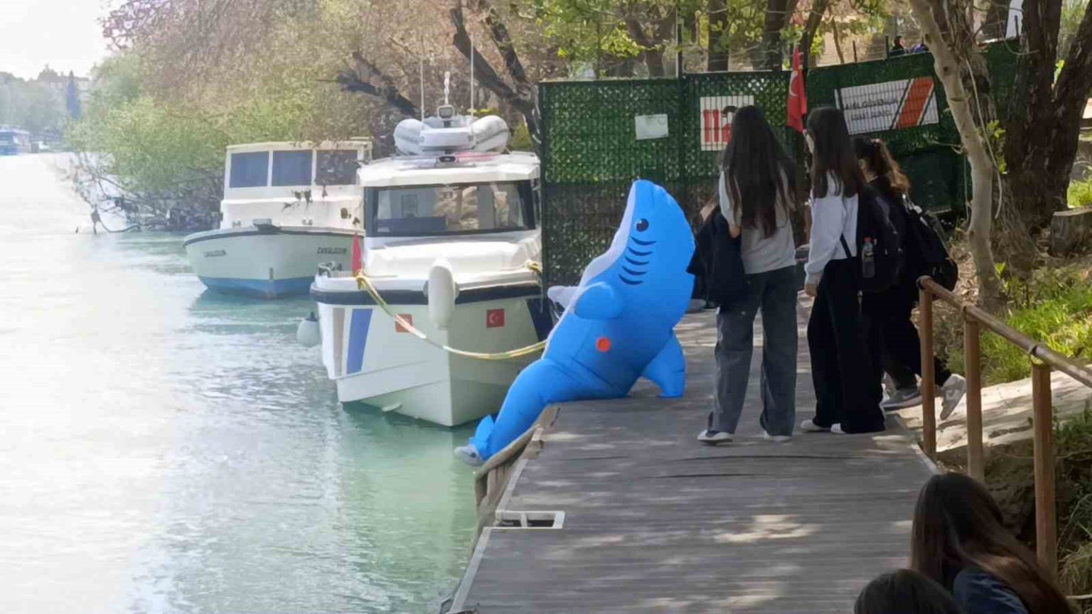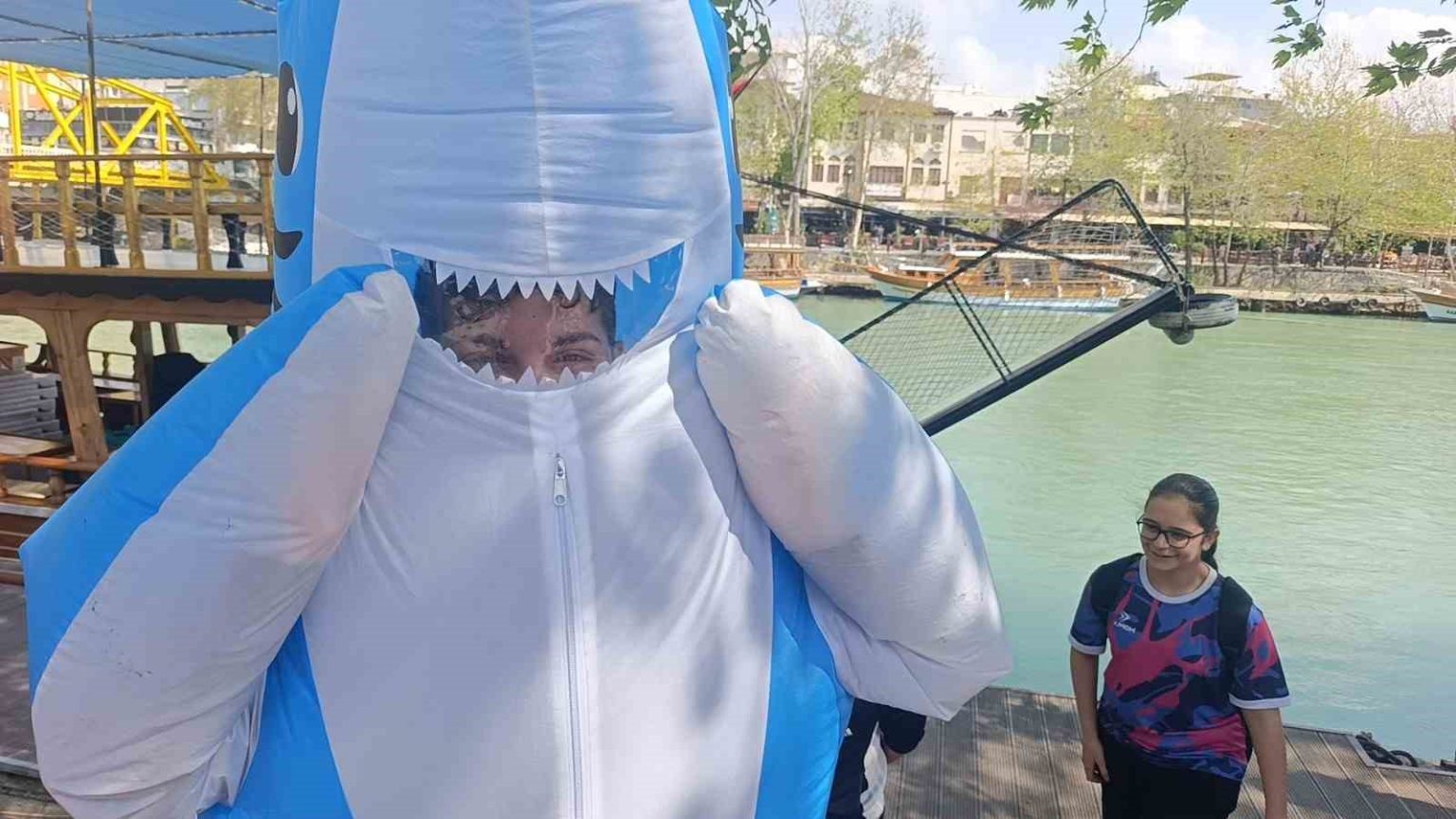 Manavgat’ın ana caddelerinde üzerinde köpek balığı kostümü giyerek dolaşan genç dikkatleri üzerinde topladı. Köpek balığı kostümüyle dolaşan genç, insanları eğlendirmek amacıyla kostüm giyerek sokaklarda dolaştığını, insanları eğlendirmenin kendisini mutlu ettiğini söyledi. Manavgat Irmak kenarına inerek ırmak kenarında oturan gençlerle şakalaşan Harun isimli genç, kendisiyle fotoğraf çektirmek isteyenlerin isteğini geri çevirmedi. Zaman zaman çalan müzik eşliğinde oynayan genç, elektrikçi olduğunu ve staj yaptığını belirterek “bugün insanları eğlendirmek, onlarla fotoğraf çektirip hoşça vakit geçirmelerini sağlamak amacıyla böyle bir işe koyuldum. Bunu da başardığıma inanıyorum” diye konuştu.
