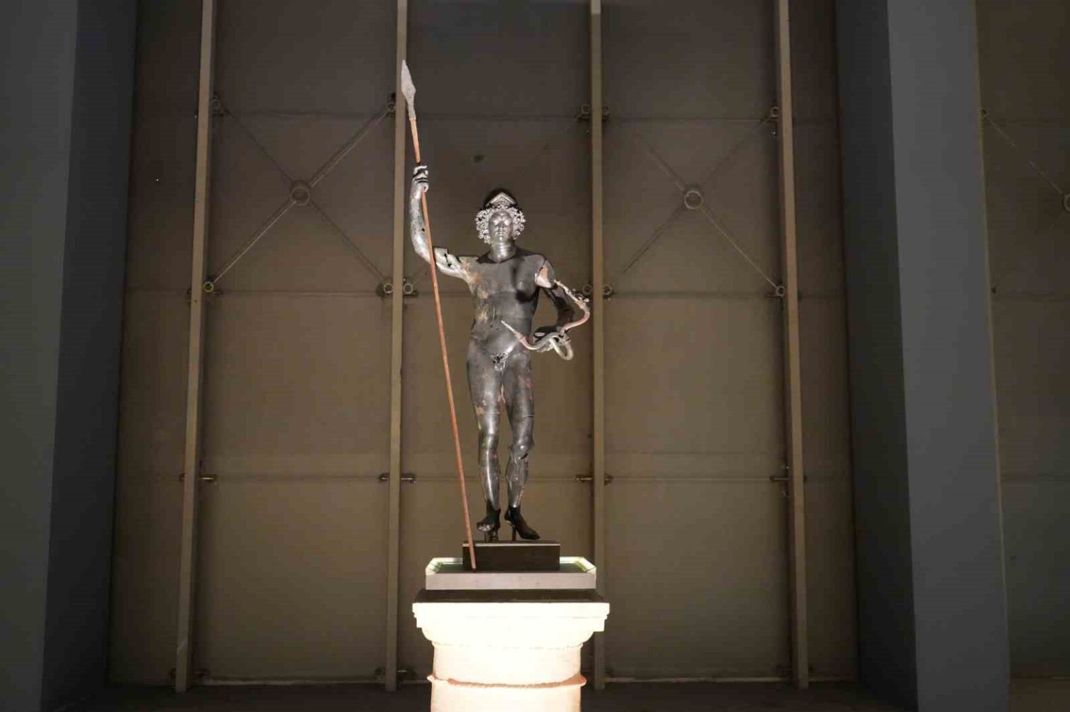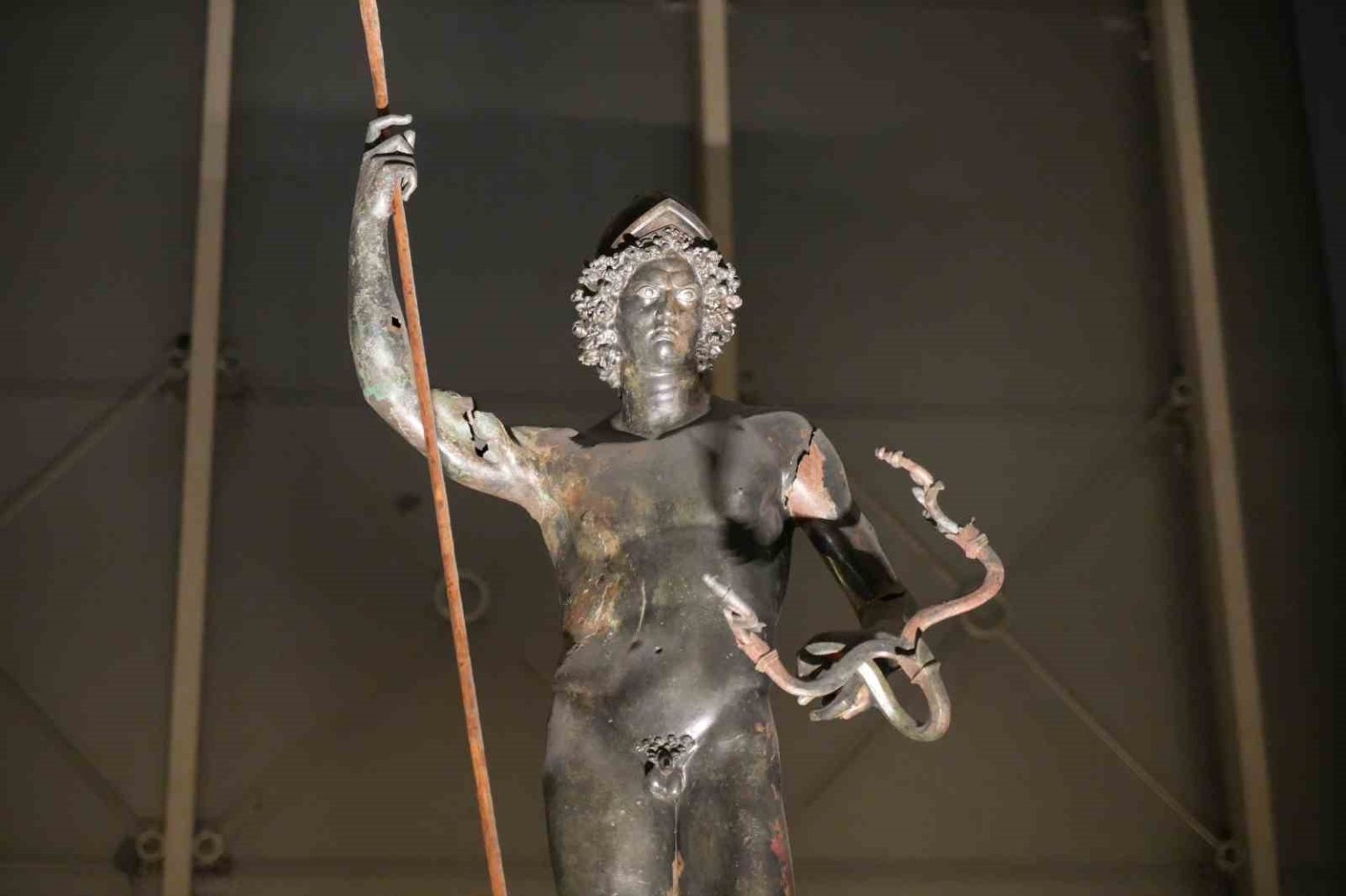 Mars heykelinin özelliklerinden bahseden Çeber, “Örneğin arkamızdaki Mars heykeline daha önceden biraz daha mesafeli bir noktadan bakabiliyorduk. Bu da bize değişik talepler getiriyordu daha yaklaşılamaz mı diye. İşte şu anda üzerinde bulunduğumuz bu terası yaptık. Mars heykelimiz bu haliyle dünyada tek. 2000 yılında Zeugma Antik Kenti’nde, yani bu müzedeki eserlerin kaynağını oluşturan antik kentte yapılan kurtarma kazılarında Poseidon villasında villanın kilerinde Sasaniler’in saldırılarından korumak için kiler de küplerin arasına saklanmış olarak bu haliyle bulunuyor. Yani bronz, bu bütüncülükte ve bu korunakta dünyada tek bir örnek. Böyle bir önemi var. Heykelimiz 160 santimetre boyunda. Ama en çarpıcı, en ayrıcı özelliklerinden birisi göz bebeklerinin altın ve gümüşten yapılmış olması. Mars biliyorsunuz savaş tanrısı. Bereket ve gücü de simgeliyor. Dolayısıyla gördüğünüz gibi bir elinde mızrak, onunla savaşı simgeliyor. Diğer elinde de kıvrımlı dallar var. Orada da bereketi simgeliyor” ifadelerini kullandı.
