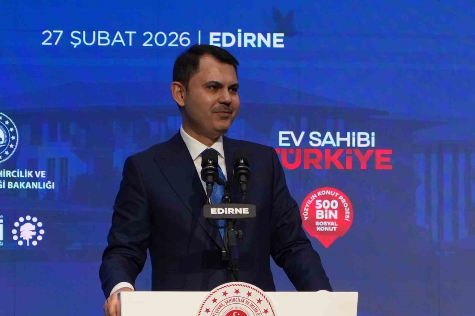 Çevre, Şehircilik ve İklim Değişikliği Bakanı Murat Kurum, Edirne’de “Yüzyılın Konut Projesi 500 Bin Sosyal Konut” kapsamında düzenlenen ’Ev Sahibi Türkiye Kura Çekim Töreni’ne katıldı. Bakan Kurum, “500 bin sosyal konut seferberliğimiz kapsamında Edirne’de inşa edeceğimiz 2 bin 537 konutumuzun kura heyecanını yaşıyoruz. Şimdiden yeni yuvalarımızın kıymetli annelerimize, babalarımıza, yavrularımıza ve gençlerimize hayırlı, uğurlu olmasını diliyorum” dedi.