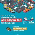 Ulaştırma ve Altyapı Bakanı Abdulkadir Uraloğlu, “Aralık ayında limanlarımızda elleçlenen yük miktarı geçen yılın aynı ayına göre yüzde 7,6 artışla 49,8 milyon ton olarak gerçekleşti. Böylece, 2025 yılı aralık ayı tüm aylar içerisinde en yüksek elleçlemenin olduğu ay oldu” dedi.