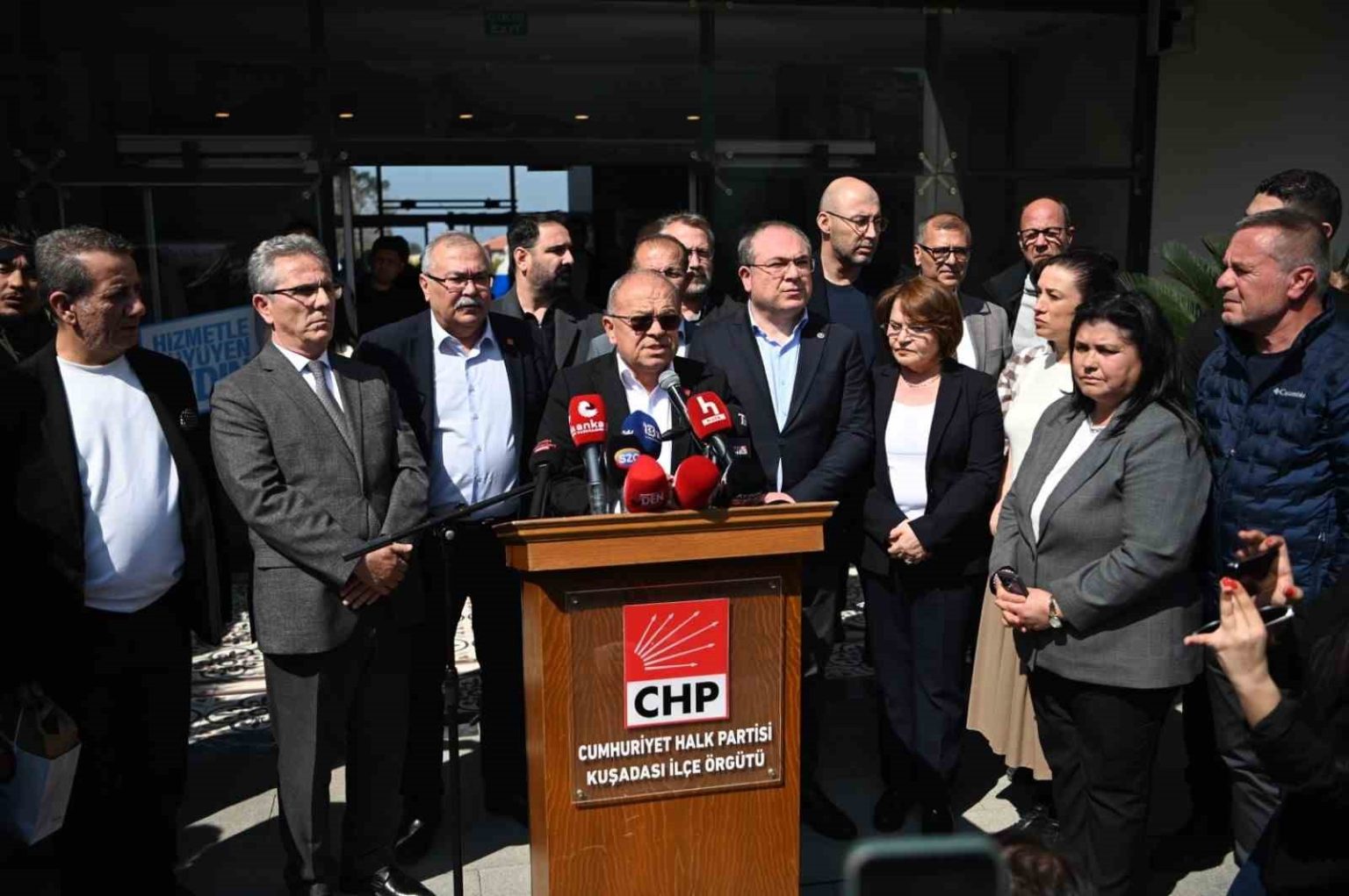 Kuşadası Belediye Başkanı Ömer Günel, İstanbul’da gözaltına alınmasının ardından CHP Aydın İl Örgütü, Kuşadası Belediyesi Ana Hizmet Binası önünde basın açıklaması düzenledi. Açıklamaya CHP Aydın Milletvekilleri Süleyman Bülbül, Evrim Karakoz, Muğla Milletvekili ve Cumhurbaşkanlığı Aday Ofisi Hukuk Politikaları Kurulu ve TBMM Adalet Komisyonu Üyesi Cumhur Uzun, CHP Aydın İl Başkanı Hikmet Saatçı, CHP Kuşadası İlçe Örgütü Başkanı Mehmet Gürbilek ve yönetimi, Aydın’daki CHP ilçe örgütlerinin yöneticileri, Efeler Belediye Başkanı Anıl Yetişkin, Didim Belediye Başkanı Hatice Gençay, Nazilli Belediye Başkanı Ertuğrul Tetik, Germencik Belediye Başkanı Burak Zencirci, Koçarlı Belediye Başkanı Özgür Arıcı, Kuyucak Belediye Başkanı Uğur Doğanca, Çine Belediye Başkanı Mehmet Kıvrak, Bozdoğan Belediye Başkanı Mustafa Galip Özel, Selçuk Belediye Başkanı Filiz Ceritoğlu Sengel, Kuşadası Belediye başkan yardımcıları, meclis üyeleri ve çok sayıda vatandaş katıldı.