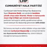 CHP Dörtyol İlçe Başkanlığı görevini yürüten Bedir’in istifasına ilişkin olarak Cumhuriyet Halk Partisi Hatay İl Başkanlığı tarafından yapılan açıklamada, son günlerde kamuoyunda yer alan iddialar ve ortaya atılan ithamların dikkate alındığı belirtildi.