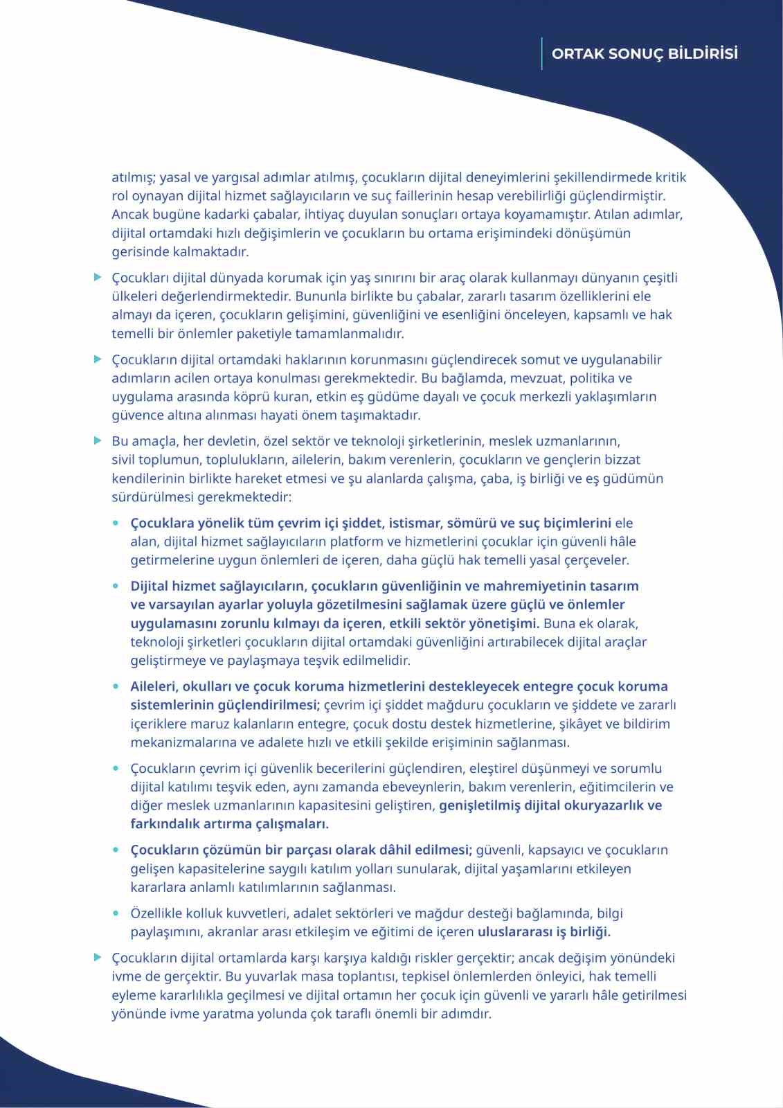 2 gün süren ve dijital dünyada çocukların güvenliği ile haklarının nasıl korunacağının müzakere edildiği programın ardından, çocuklar için daha güvenli dijital alanların oluşturulmasına yönelik öncelik alanları ve çözüm yollarını içeren bir sonuç bildirisi yayımlandı. Bildiride, çevrim içi platformlarda çocukların güvenliğinin sağlanmasına yönelik ortak irade vurgulandı. Ayrıca, daha güçlü hak temelli yasal çerçevelerin belirlenmesi, dijital hizmet sağlayıcıların, güvenliği artırabilecek önlemler almasının zorunlu kılınması, aileleri, okulları ve çocuk koruma hizmetlerini destekleyecek entegre çocuk koruma sistemlerinin güçlendirilmesi, genişletilmiş dijital okuryazarlık ve farkındalık artırma çalışmalarının yapılması, Çocukların çözümün bir parçası olarak sürece dahil edilmesi gerekliliği üzerinde duruldu.