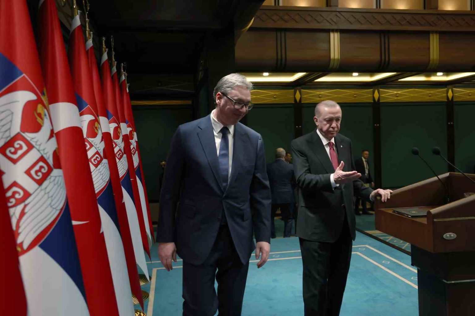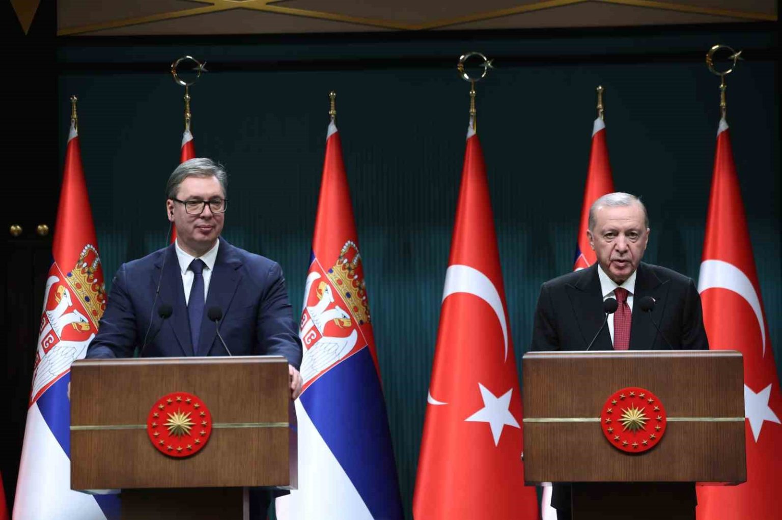 Cumhurbaşkanı Erdoğan, Sırbistan Cumhurbaşkanı Aleksandar Vucic ile Cumhurbaşkanlığı Külliyesinde bir araya geldi. Cumhurbaşkanı Erdoğan, Aleksandar Vucic’i resmi törenle karşıladı ve daha sonra ikili görüşme gerçekleştirdi. Heyetler arası gerçekleştirilen diğer görüşmenin ardından Cumhurbaşkanı Erdoğan ve Aleksandar Vucic ortak basın toplantısı düzenledi.