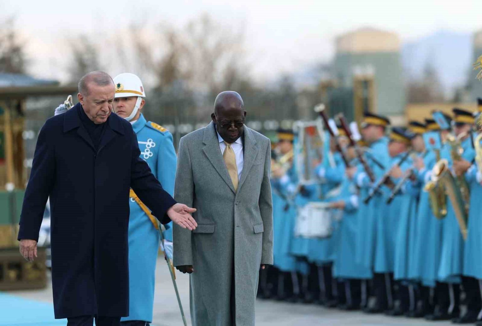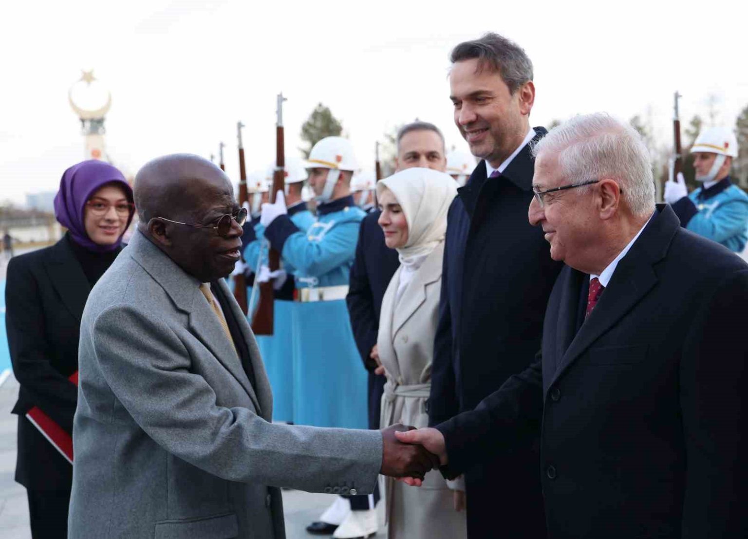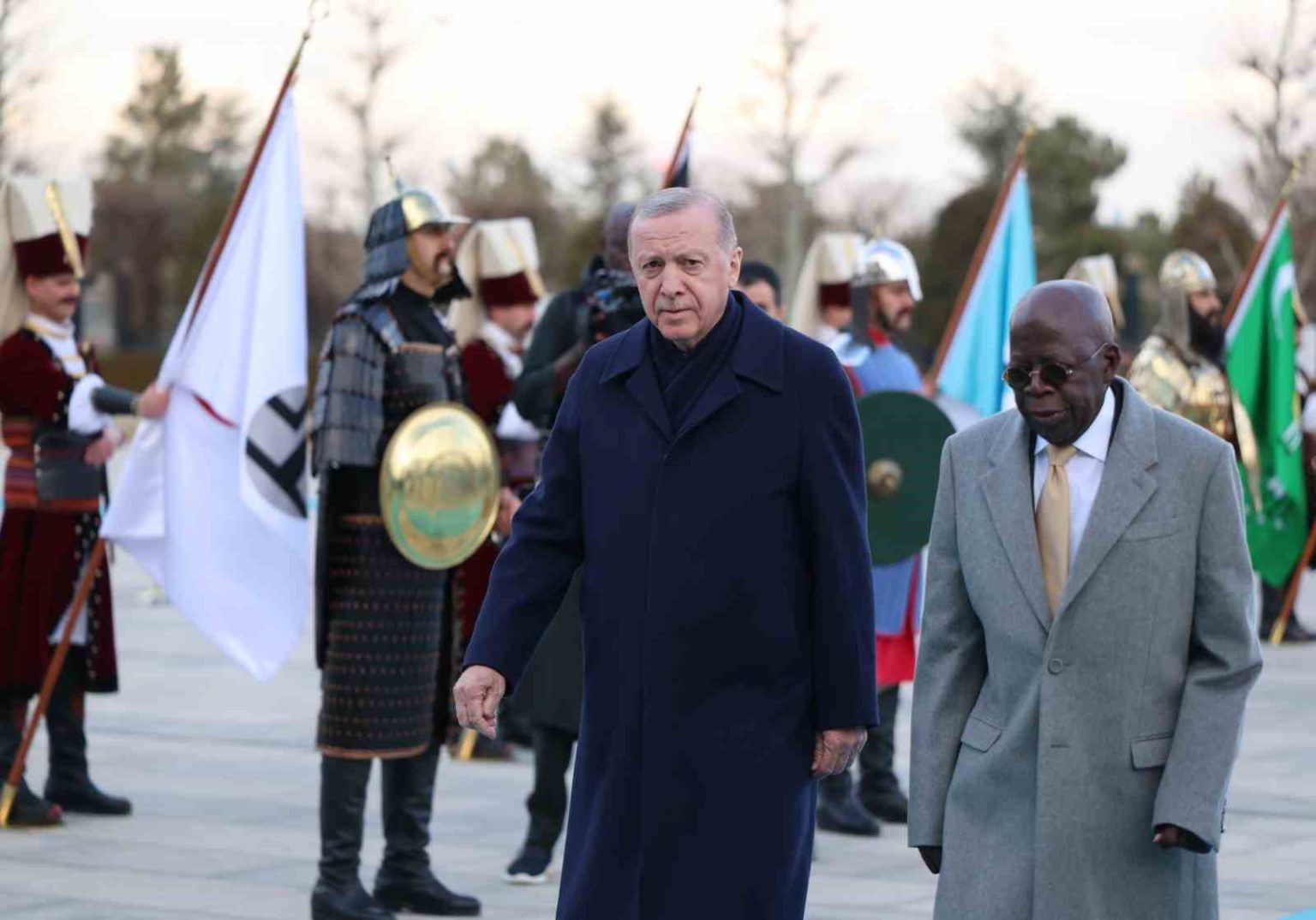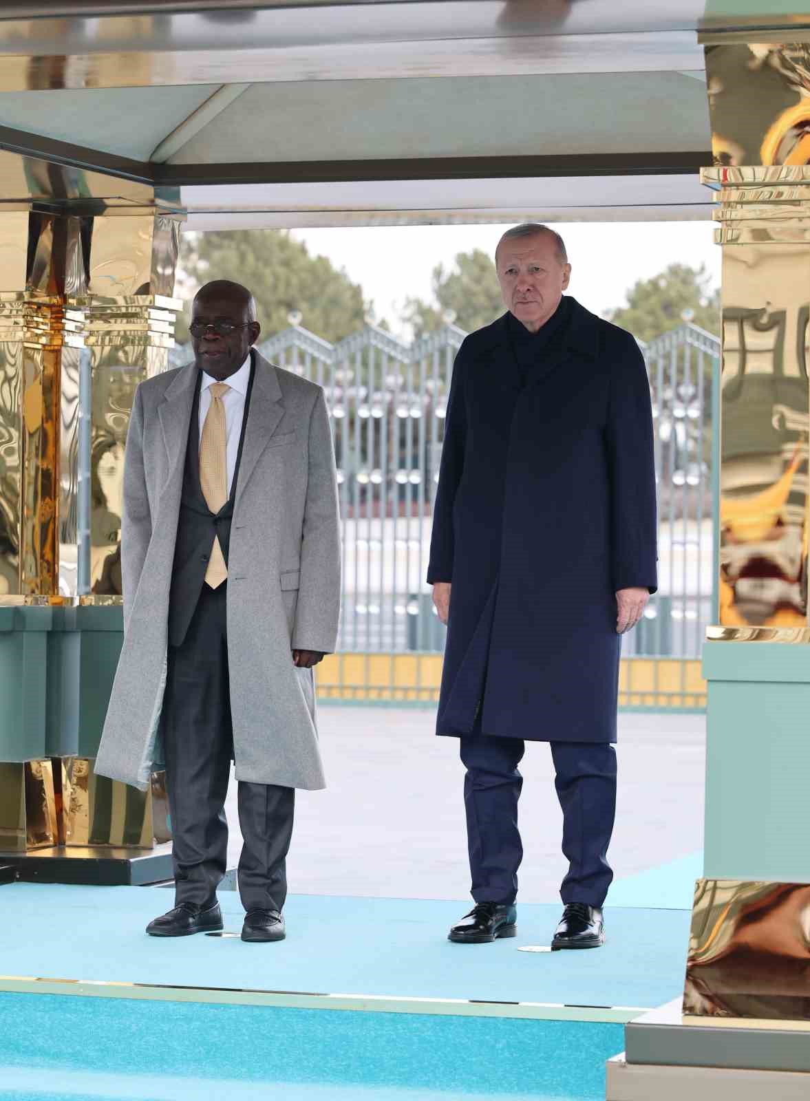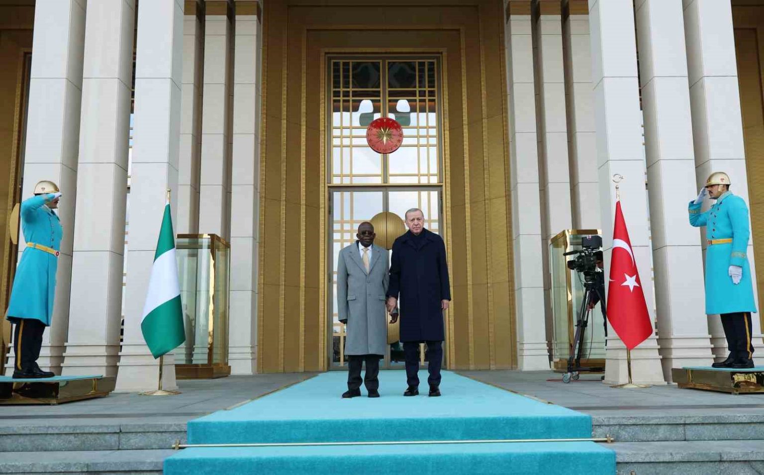Konuk Nijerya Cumhurbaşkanı Bola Ahmed Tinubu’nun içinde bulunduğu makam aracını Cumhurbaşkanlığı Külliyesi’nin önündeki caddede karşılayan süvariler, Bola Ahmed Tinubu’ya protokol kapısına kadar eşlik etti. Cumhurbaşkanı Erdoğan, Tinubu’yu Cumhurbaşkanlığı Külliyesi’nin ana giriş kapısında karşıladı. Erdoğan ve Ahmed Tinubu tören alanındaki yerlerini almalarının ardından, 21 pare top atışı eşliğinde iki ülkenin milli marşları çalındı. Tinubu, Muhafız Alayı Tören Kıtası’nı ’Merhaba Asker’ diyerek selamladı. Törende, tarihte kurulan 16 Türk Devletini temsil eden bayraklar ve askerler de yer aldı. Heyetlerini birbirine takdim eden Erdoğan ve Tinubu merdivenlerde Türkiye ve Nijerya bayrakları önünde gazetecilere poz verdi.