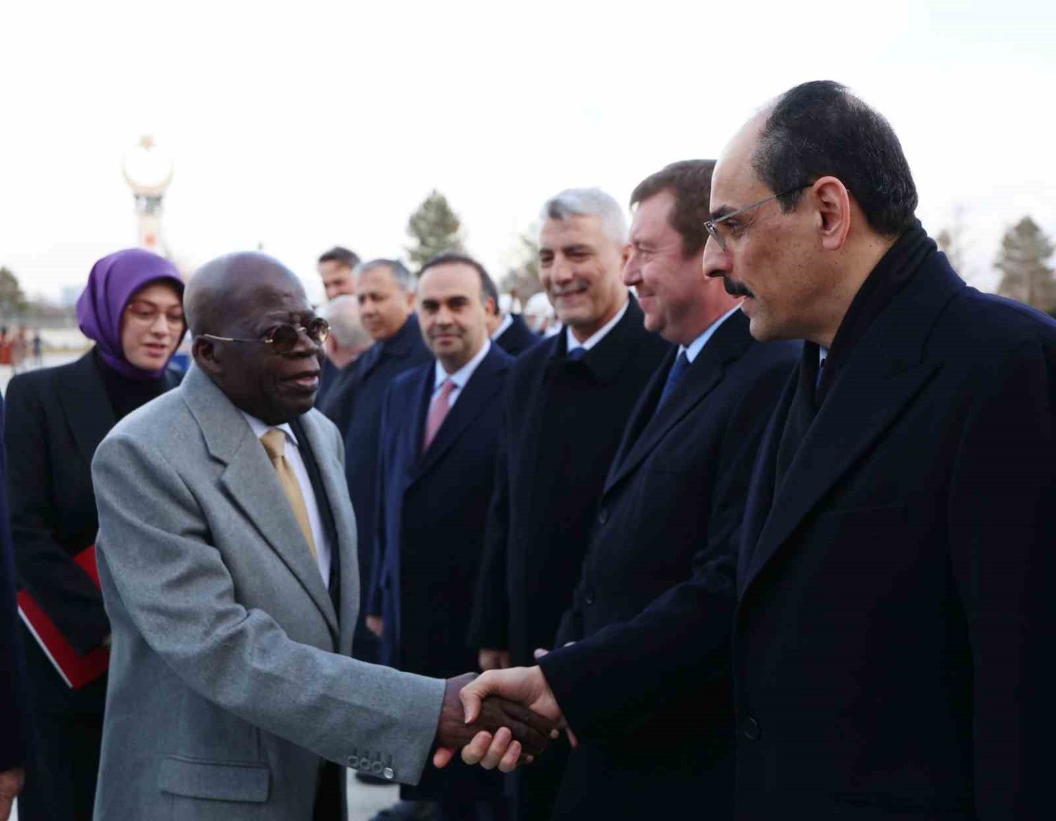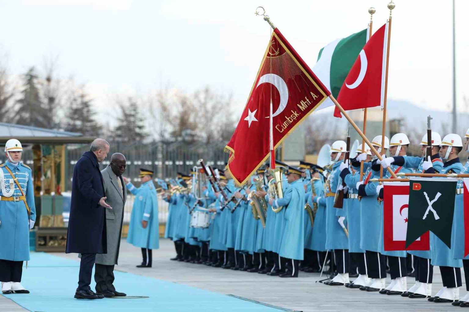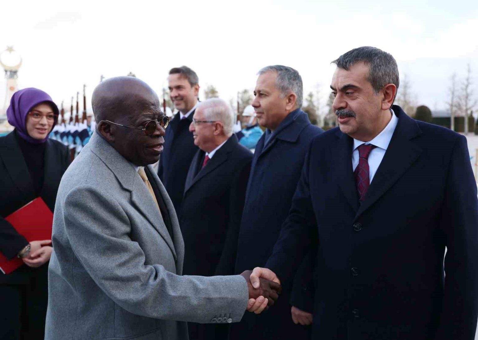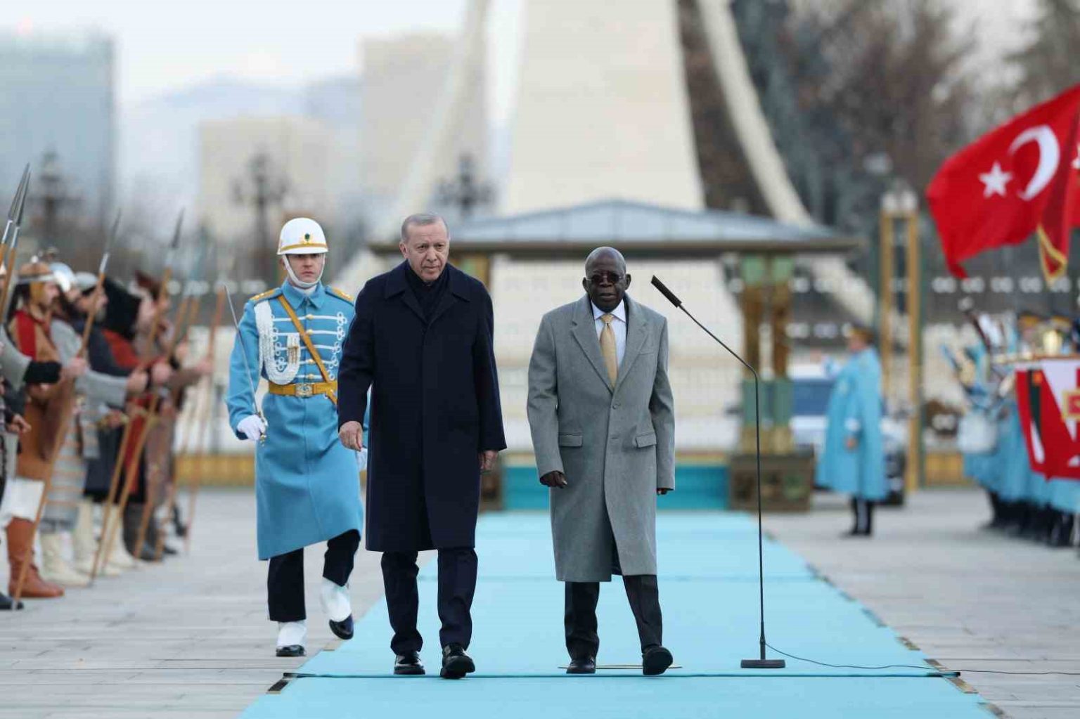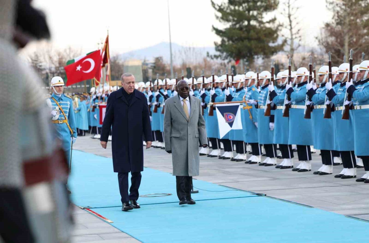 Konuk Nijerya Cumhurbaşkanı Bola Ahmed Tinubu’nun içinde bulunduğu makam aracını Cumhurbaşkanlığı Külliyesi’nin önündeki caddede karşılayan süvariler, Bola Ahmed Tinubu’ya protokol kapısına kadar eşlik etti. Cumhurbaşkanı Erdoğan, Tinubu’yu Cumhurbaşkanlığı Külliyesi’nin ana giriş kapısında karşıladı. Erdoğan ve Ahmed Tinubu tören alanındaki yerlerini almalarının ardından, 21 pare top atışı eşliğinde iki ülkenin milli marşları çalındı. Tinubu, Muhafız Alayı Tören Kıtası’nı ’Merhaba Asker’ diyerek selamladı. Törende, tarihte kurulan 16 Türk Devletini temsil eden bayraklar ve askerler de yer aldı. Heyetlerini birbirine takdim eden Erdoğan ve Tinubu merdivenlerde Türkiye ve Nijerya bayrakları önünde gazetecilere poz verdi.