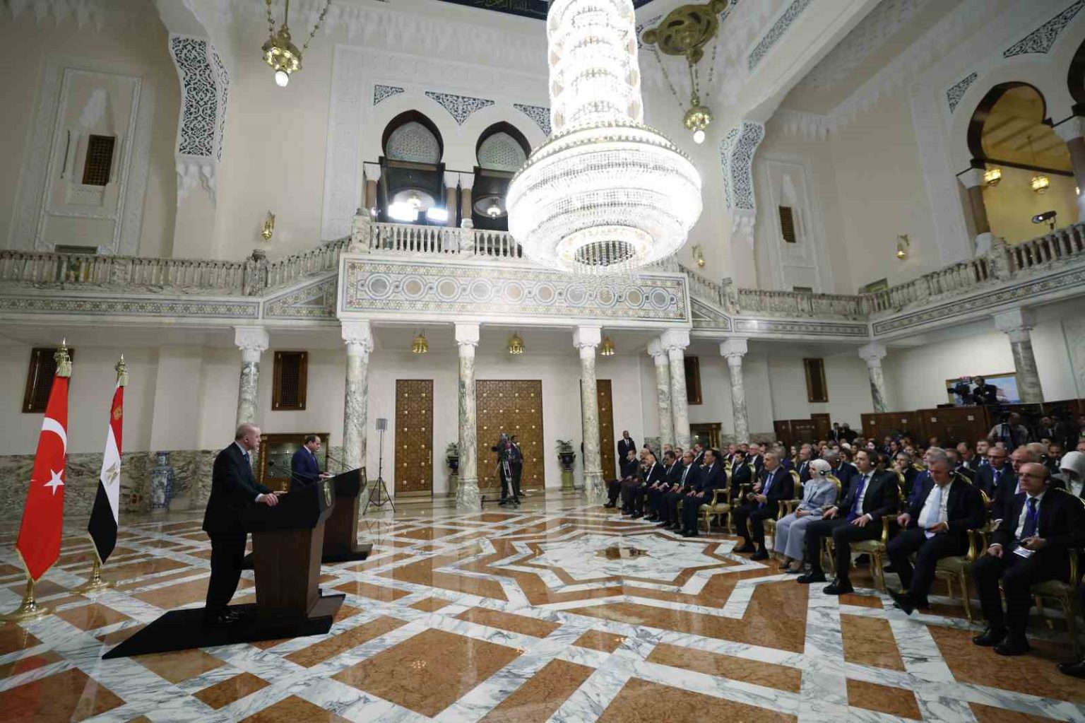 Cumhurbaşkanı Erdoğan, ilk toplantısını 2024 Eylül’de Ankara’da yaptıkları Yüksek Düzeyli Stratejik İşbirliği Konseyinin ikinci toplantısı vesilesiyle Mısır’ın başkenti Kahire’de bulunmaktan büyük memnuniyet duyduğunu dile getirdi. Şahsına ve heyetine gösterdikleri sıcak misafirperverlik için Sisi ile kendilerini büyük bir muhabbetle karşılayan Mısırlılar’a teşekkür eden Cumhurbaşkanı Erdoğan, “Bin yıllık ortak mazimizle yoğrulan kardeşlik bağlarımızdan sadece halklarımızın refahı için değil Filistin ile bölgemizin istikrarına katkı için de faydalanmak istiyoruz. Sayın Sisi’yle belirlediğimiz bu ortak vizyon sayesinde ilişkilerimizin her alanda daha ileri taşındığını memnuniyetle müşahede ediyoruz” dedi.