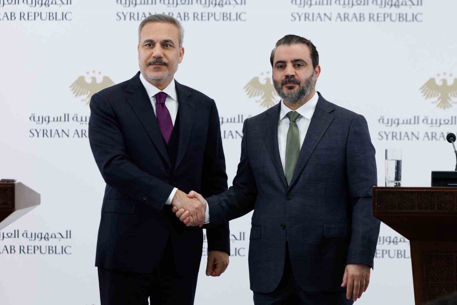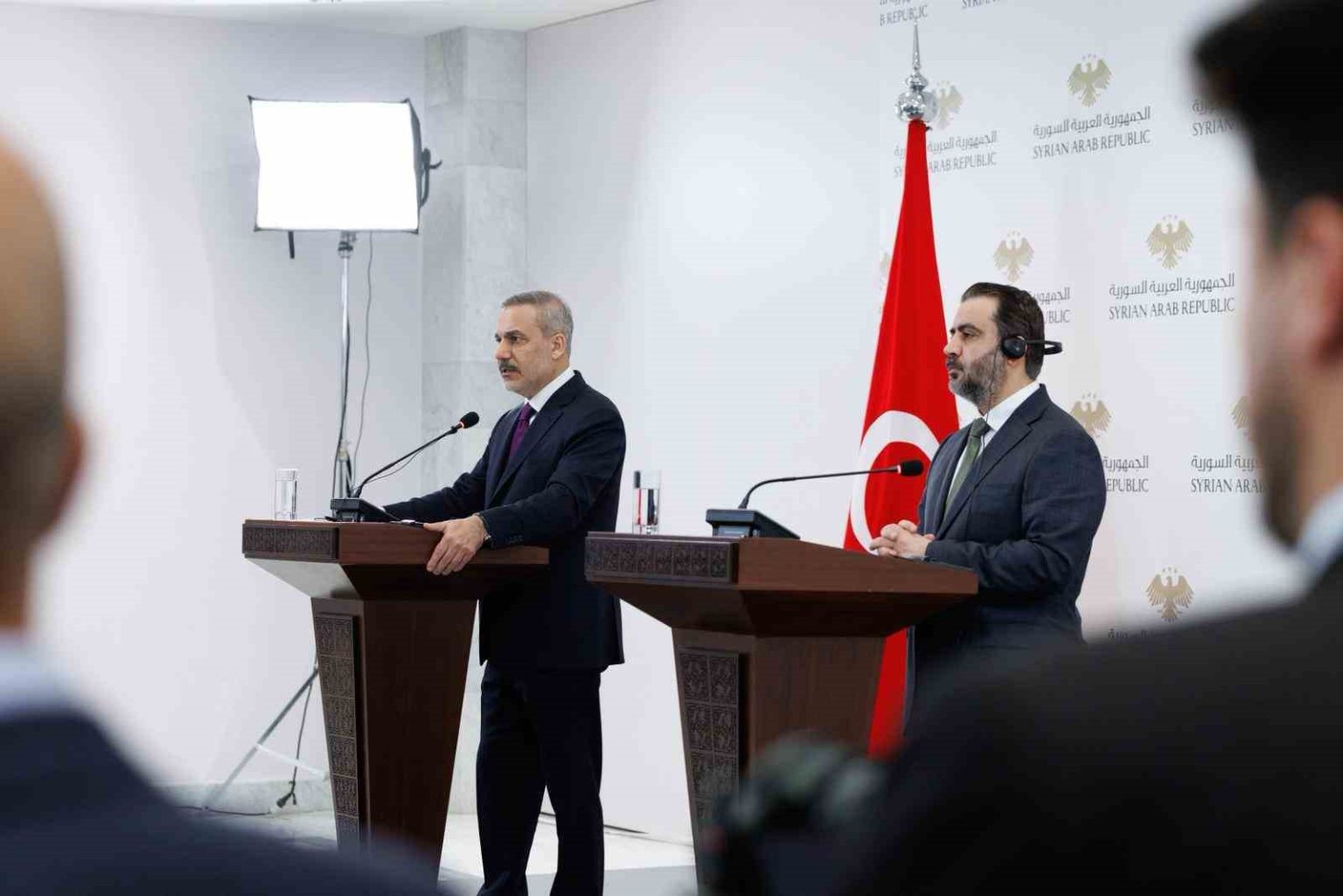 Dışişleri Bakanı Hakan Fidan, Suriye’deki temaslarının ardından Suriye Dışişleri Bakanı Esad Hasan Şeybani ile ortak basın toplantısı düzenledi. Basın toplantısında ev sahipliğinden ötürü Suriye Devlet Başkanı Ahmed eş-Şara’ya teşekkür ederek başlayan Fidan, Suriye’nin özgürleştirilmesinden sonra Suriye’ye ziyaret gerçekleştiren ilk dışişleri bakanının kendisi olduğunu ve bugün Suriye’nin özgürleştirilmesinin birinci yılından sonra Suriye’de bulunmanın gururunu yaşadığını ifade etti. Bakan Fidan, “Tabi biz başka bir formatta geldik. 3+3 formatı dediğimiz, Milli Savunma Bakanımız ve İstihbarat Başkanımız da beraberimizdeydi. Sayın Yaşar Güler ve Sayın İbrahim Kalın beraberliğinde, Sayın Ahmed eş-Şara ve Esad Şeybani olmak üzere birçok arkadaşla çok verimli görüşmelerde bulunduk. Önemli konuları tartıştık. Bölgesel konular, ikili konular, Suriye’ye ait konular. Bunların hepsini teker teker stratejik iş birliğimize yakışır şekilde detaylı bir şekilde ele aldık. Türkiye olarak bizim Suriye’nin istikrarına verdiğimiz önemi biliyorsunuz” dedi.