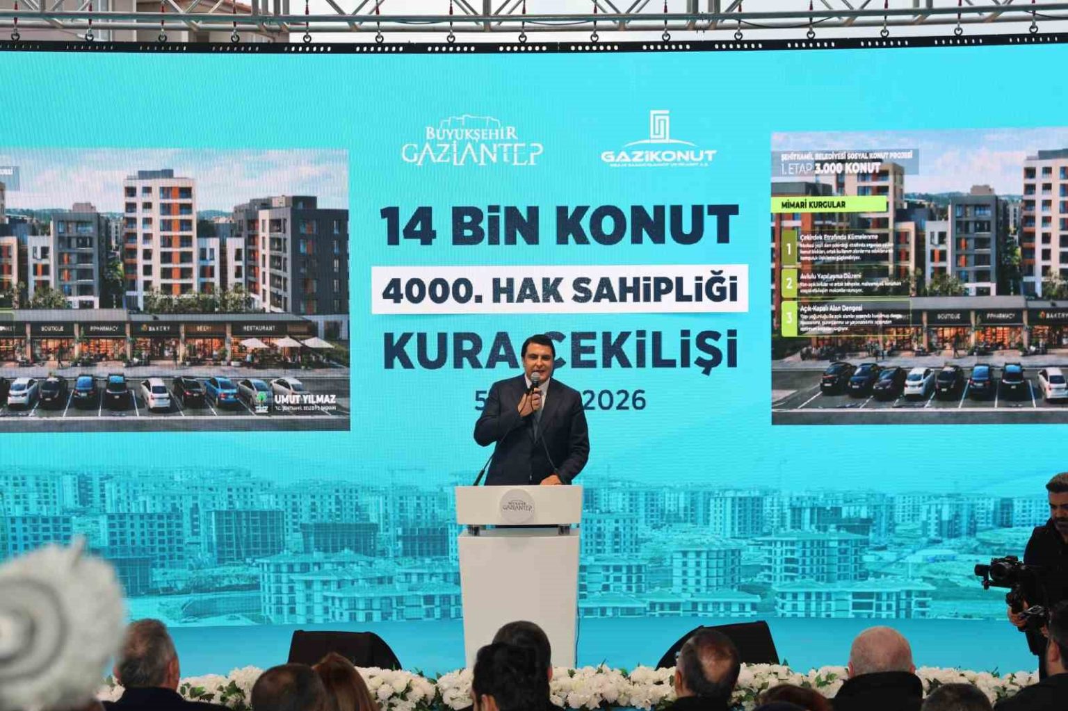 Cumhurbaşkanı Yardımcısı Cevdet Yılmaz, Gaziantep Büyükşehir Belediyesi’nin 14 Bin Konut Projesi kapsamında Güneyşehir’deki 4 bininci konutun hak sahipliği kura çekim törenine katıldı.