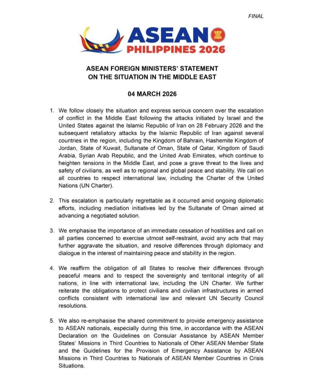 Bildiride çatışmaların derhal sona erdirilmesinin önemine vurgu yapılarak, tüm taraflara azami itidal göstermeleri, durumu daha da ağırlaştırabilecek adımlardan kaçınmaları ve anlaşmazlıkları diplomasi ve diyalog yoluyla çözmeleri çağrısında bulunuldu. Ayrıca silahlı çatışmalarda sivillerin ve sivil altyapının korunmasının uluslararası hukuk ve ilgili Birleşmiş Milletler Güvenlik Konseyi kararları çerçevesindeki yükümlülükler hatırlatıldı. ASEAN, krizden etkilenen üye ülke vatandaşlarına acil konsolosluk ve insani destek sağlanması konusunda ortak hareket edileceğini de duyurdu.