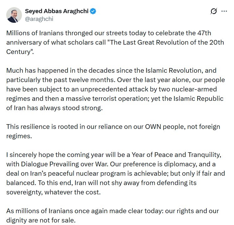İran Dışişleri Bakanı Abbas Arakçi, İslam Devrimi’nin 47’nci yıldönümünün coşkuyla kutlandığını belirterek, “Gelecek yılın, savaşın yerine diyaloğun galip geldiği bir barış ve huzur yılı olmasını içtenlikle umuyorum. Tercihimiz diplomasidir ve İran’ın barışçıl nükleer programı konusunda bir anlaşmaya varılabilir. Ancak bu anlaşma sadece adil ve dengeli olduğu takdirde mümkündür. İran, bedeli ne olursa olsun bu uğurda egemenliğini savunmaktan çekinmeyecektir” açıklamasında bulundu.