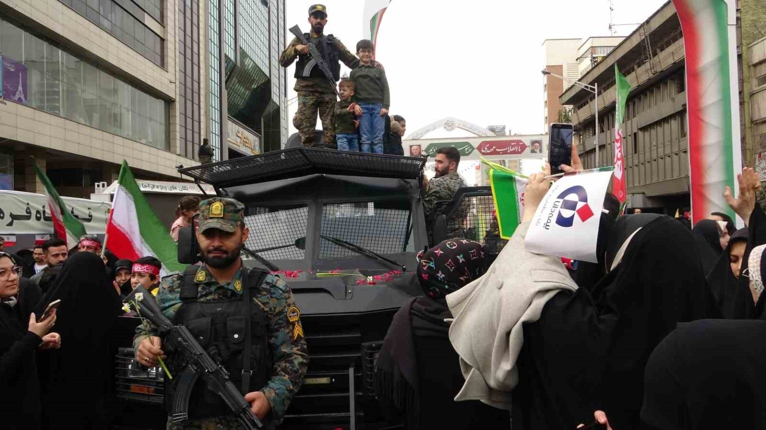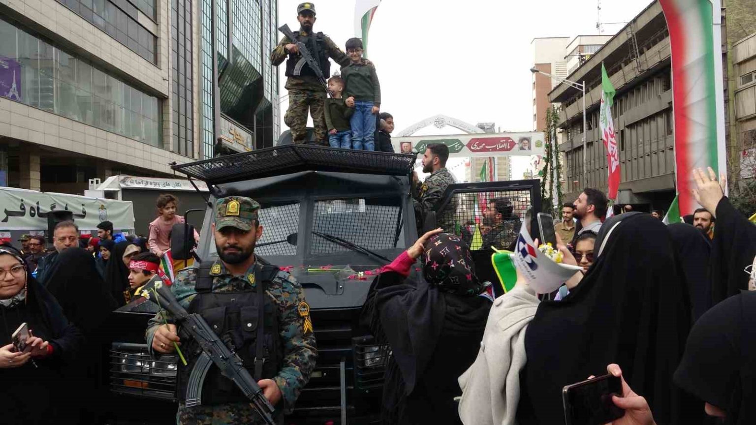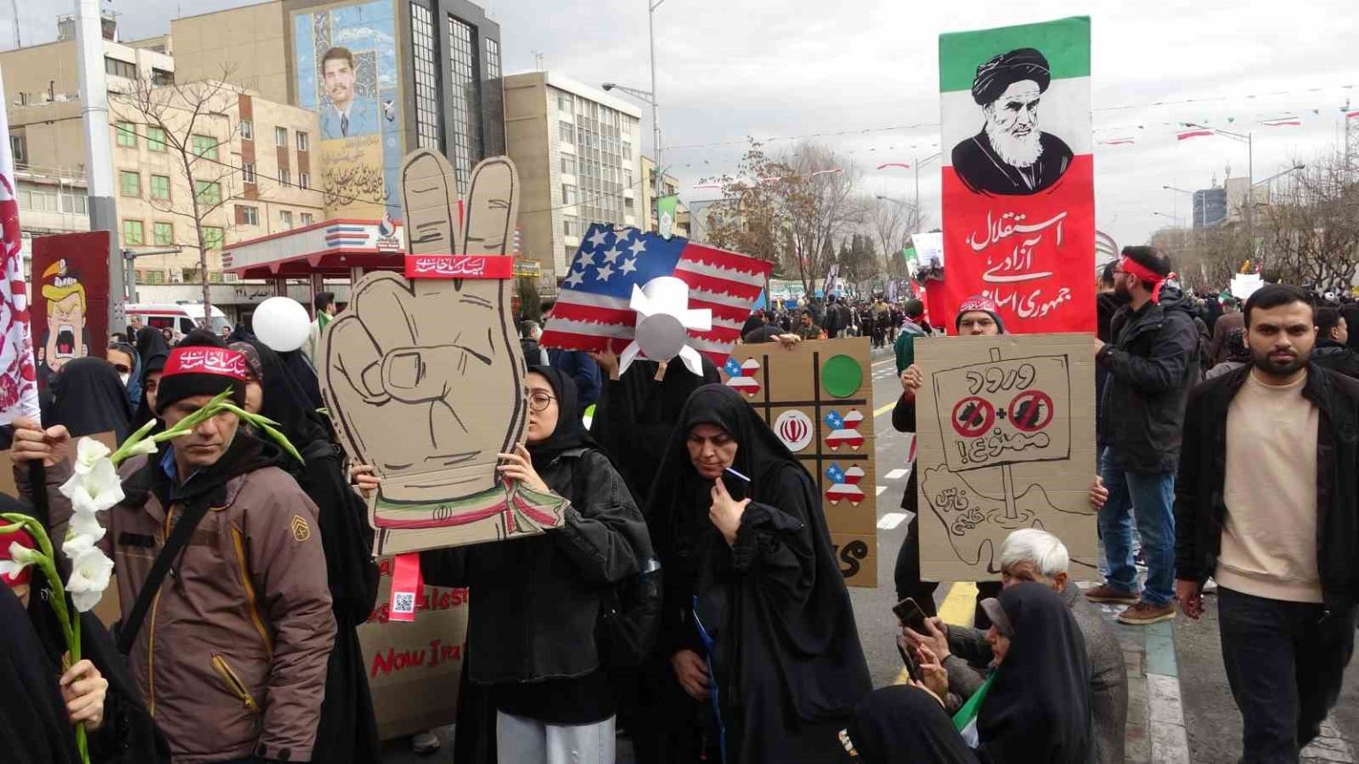 Yürüyüş güzergahı boyunca 12 günlük savaşta hayatını kaybeden komutanların posterleri asıldı. Halkın farklı kesimlerinden milyonlarca kişinin katıldığı yürüyüşte “Kahrolsun ABD”, “Kahrolsun İsrail”, “Pehlevi’ye ölüm”, “Siyonist cinayet işliyor, şeytan destekliyor” sloganları atıldı. İran bayraklarının dalgalandığı yürüyüşte, “Savaştan korkmuyoruz”, “Sonuna kadar direneceğiz”, “Sizin devriminizin X’te takipçileri var, bizim devrimimiz sokaklarda” ve “ABD ne oldu? Korktun mu?” yazılı pankartlar taşındı.