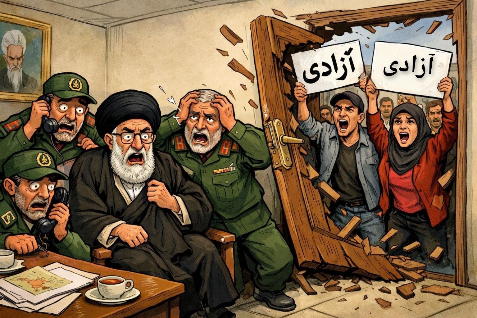 Üçüncü paylaşımda ise protestocuların kapıyı kırarak içeri girdiği sırada İran dini lideri Ayetullah Ali Hameney ve İran Devrim Muhafızları Ordusundan üst düzey liderlerin bir odada saklandığını gösteren karikatüre yer verildi. Paylaşımda, “İsrail için belirledikleri yıkım takvimi şimdi kendileri için belirlenmiş oldu” ifadeleri kullanıldı.