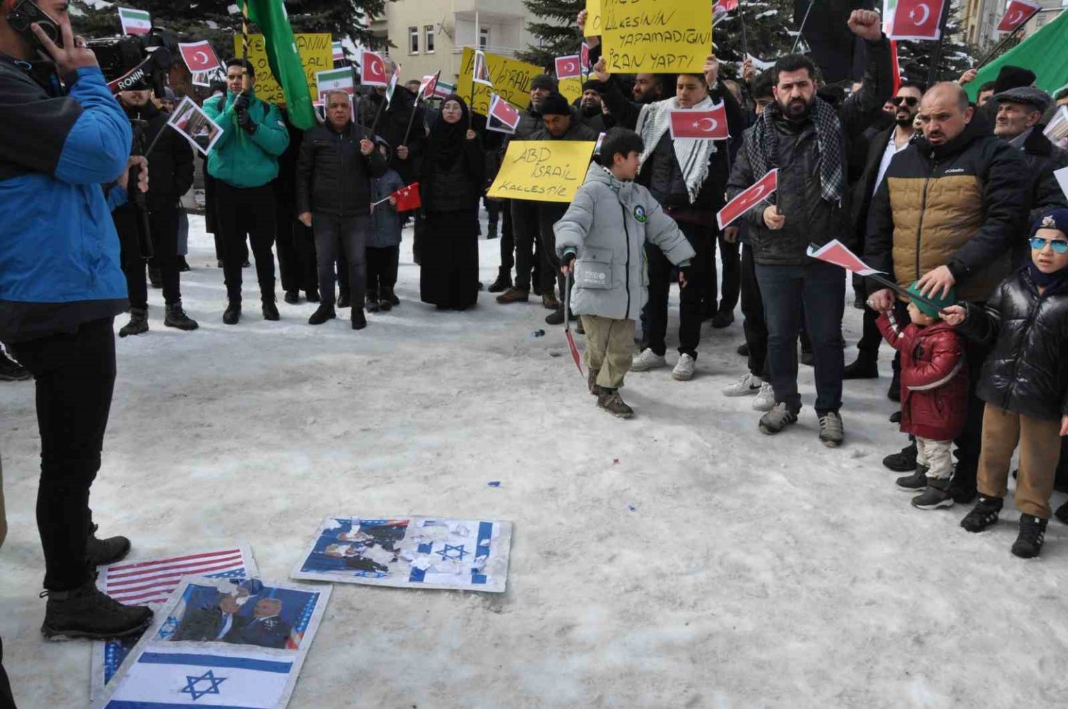 Amerika ve İsrail bayraklarının bulunduğu dövizler yere atılırken, İran’da hayatını kaybedenler anıldı.