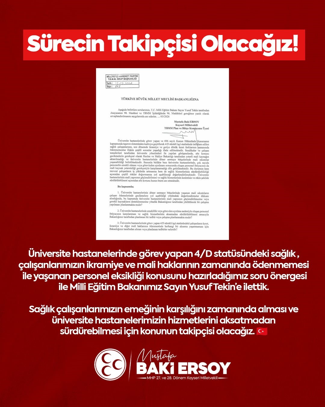 Milliyetçi Hareket Partisi (MHP) Kayseri Milletvekili Baki Ersoy, üniversite hastanelerinde görev yapan 4/D statüsündeki sağlık çalışanlarının ikramiye ve mali haklarında yaşanan gecikmeler ile personel eksikliğini TBMM gündemine taşıdı.
