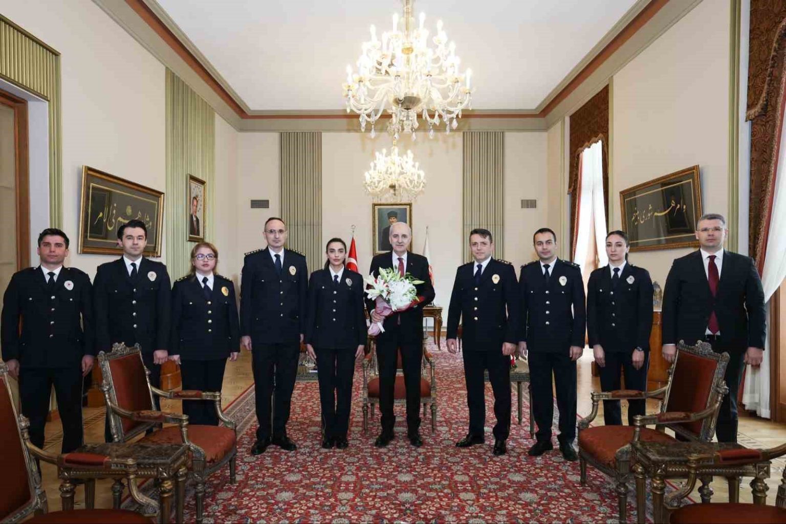 TBMM Başkanı Numan Kurtulmuş, TBMM Koruma Daire Başkanı Murat Çelik ve beraberindeki heyeti kabul etti. TBMM’nin X hesabından kabule ilişkin yapılan paylaşımda, “TBMM Koruma Daire Başkanlığı bünyesinde görev yapan personel başta olmak üzere ülkemizin dört bir yanında fedakârca görev yapan polislerimizin gününü kutlayan Kurtulmuş, milletimizin huzuru ve güvenliği uğruna canlarını feda eden aziz şehitlerimizi rahmetle, kahraman gazilerimizi ise minnetle ve saygıyla andı. Gazi Meclis’in güvenliğinin emniyet teşkilatına emanet olduğunu belirten Kurtulmuş, ülke genelinde huzur ve asayişin sağlanması için büyük bir özveriyle görev yapan polislerimize teşekkür ederek, görevlerinde başarılar diledi” denildi.