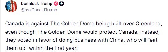 ABD Başkanı Donald Trump, Kanada’nın Grönland’a Altın Kubbe (Golden Dome) savunma kalkanının inşa edilmesine karşı çıktığını belirterek, “Oysa Altın Kubbe Kanada’yı da koruyacak. Bunun yerine Kanada, ilk yıl içinde kendilerini ‘yutacak’ olan Çin ile iş yapmayı tercih etti” açıklamasında bulundu.