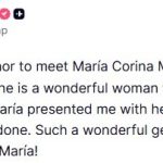 ABD Başkanı Donald Trump ise kendisine ait Truth sosyal medya platformundan yaptığı paylaşımda Machado’nun jestini doğrulayarak, “Bugün Venezuela’dan Maria Corina Machado ile tanışmak benim için büyük bir onurdu. Çok şey yaşamış harika bir kadın. Maria, yaptığım çalışmalar nedeniyle bana Nobel Barış Ödülü’nü takdim etti. Karşılıklı saygının harika bir göstergesi. Teşekkür ederim Maria!” ifadelerini kullandı.