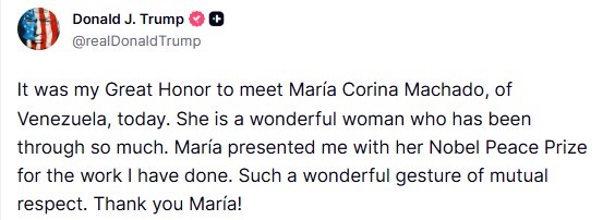 ABD Başkanı Donald Trump ise kendisine ait Truth sosyal medya platformundan yaptığı paylaşımda Machado’nun jestini doğrulayarak, “Bugün Venezuela’dan Maria Corina Machado ile tanışmak benim için büyük bir onurdu. Çok şey yaşamış harika bir kadın. Maria, yaptığım çalışmalar nedeniyle bana Nobel Barış Ödülü’nü takdim etti. Karşılıklı saygının harika bir göstergesi. Teşekkür ederim Maria!” ifadelerini kullandı.
