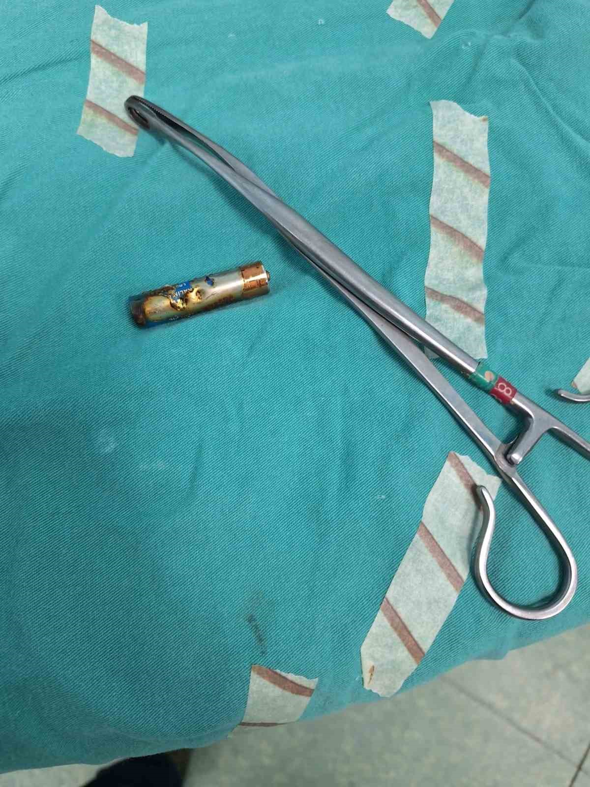 Yaşanan olayla ilgili bilgi veren Doç. Dr. Mehmet Uysal, “Acil polikliniğimize kusma şikayeti ile 6 aylık bir kız bebek getirilmiş ve bize haber verildi. Biz de vakit kaybetmeden geldik, hastamızı gördük. Yapılan tetkikler sonucunda, ağız tabanına oturan ve yemek borusunun birinci darlığına kadar uzanan, kumanda pili dediğimiz bir pille karşılaştık. Filmde ve muayenede bunu gördük. Hastayı ilk gördüğümüzde bayağı siyanotik durumda, solunum sıkıntılıydı ve oksijen satürasyonu 90 civarındaydı. Böyle olunca bir an önce beklemeden hızlı bir şekilde ameliyathaneye götürdük. Orada ameliyathanedeki anestezi uzmanlarımız ve personel bize yardımcı oldu, hasta hızlı bir şekilde entübe edildi. Ondan sonra da laringoskop ve magill forseps dediğimiz malzemelerimizle bu yabancı cismi çıkarmış olduk. Bir an evvel müdahale ettik, iyi ki müdahale ettik, orada ağız tabanında, özellikle ön kısmında hasar oluşmuştu. Müdahale sonrasında da hastanın solunum problemleri bir süre devam etti, bu yüzden 24 saat takip ettik. Herhangi bir problem oluşmayınca 24 saat sonra kontrole gelmek üzere hastayı taburcu ettik” diye konuştu.