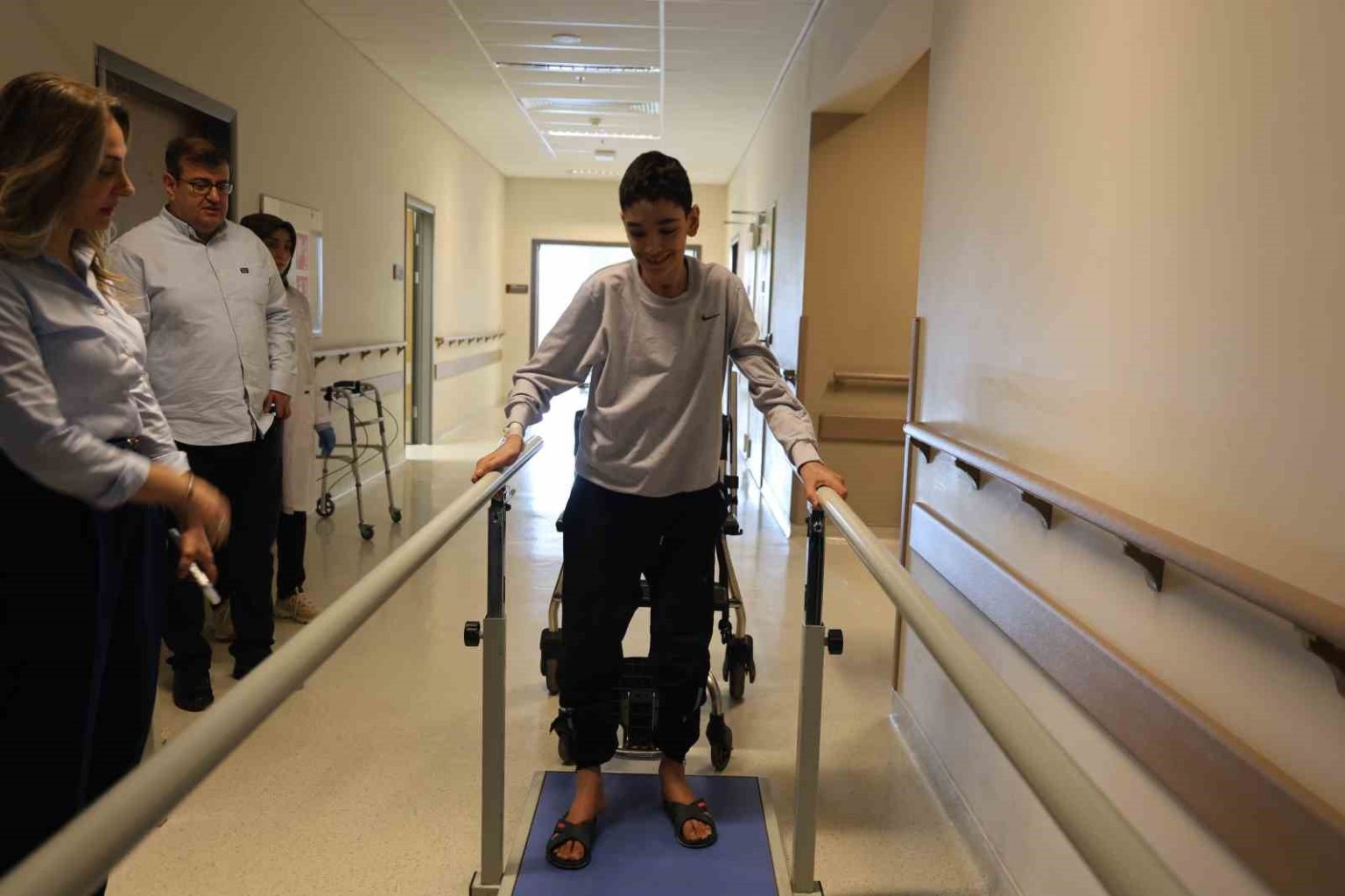 Bingöl’de 2 yıl önce otoimmün miyelit tanısıyla Elazığ Fethi Sekin Şehir Hastanesine sevk edilen 14 yaşındaki Aziz Enül, yapılan başarılı tedavilerin ardından 2 yılın sonunda destekli bir şekilde yürümeye başladı.