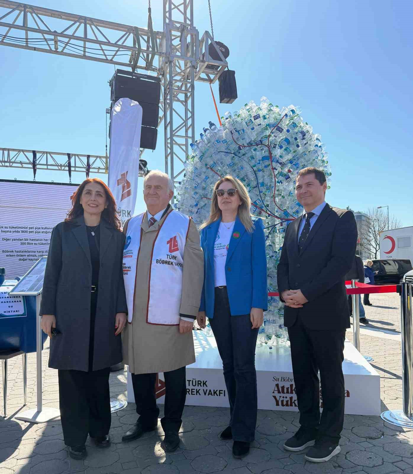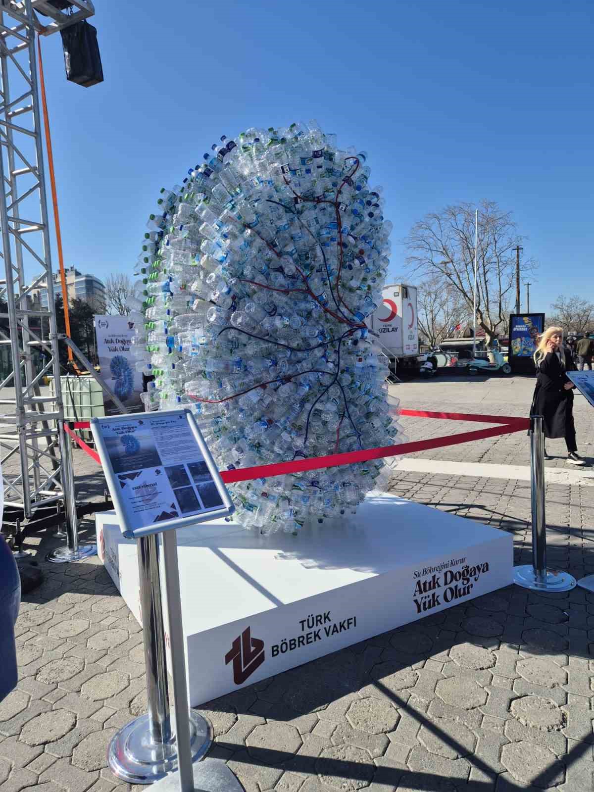Dünya Böbrek Günü kapsamında, Türk Böbrek Vakfı tarafından 1800 pet şişe kullanılarak hazırlanan 2,5 metre yüksekliğinde dev böbrek maketi, vatandaşların yoğun ilgisiyle karşılandı. Yaklaşık 2,5 metre yüksekliğinde ve 150 kilogram ağırlığındaki maket, plastik tüketiminin doğaya etkisini sembolik bir şekilde gözler önüne serdi. Düzenlenen etkinlikte hem böbrek hastalıklarına dikkat çekildi hem de su kaynaklarının korunmasının önemi vurgulandı. Etkinlikte konuşan Türk Böbrek Vakfı Başkanı Timur Erk, “Türkiye’de yaklaşık 72 bin son dönem kronik böbrek yetmezliği hastası bulunuyor. Bu hastaların yaklaşık 69 bini hemodiyaliz, 3 bini ise periton diyalizi tedavisi ile yaşamını sürdürüyor. Hemodiyaliz tedavisinde kullanılan su miktarı ise konunun çevresel boyutunu ortaya koyuyor. Bir hastanın 4 saatlik tek bir hemodiyaliz seansında en az 200 litre şebeke suyu kullanılıyor. Türkiye genelinde yılda yaklaşık 2-2,5 milyon ton su, bu tedavi sürecinde kullanıldıktan sonra atığa dönüşüyor” dedi. Erk, kronik böbrek yetmezliğinin büyük ölçüde önlenebilir bir hastalık olduğuna dikkat çekerek, “Böbreklerimizi korumak aslında doğal kaynaklarımızı korumaktır. İklim değişikliği ve su kaynaklarının giderek azalması, suyun değerini her zamankinden daha önemli hale getiriyor. Günlük 2-2,5 litre su tüketimi gibi basit alışkanlıklar hem böbrek sağlığımızı koruyabilir hem de sağlık sistemindeki büyük yükün önüne geçebilir” dedi.