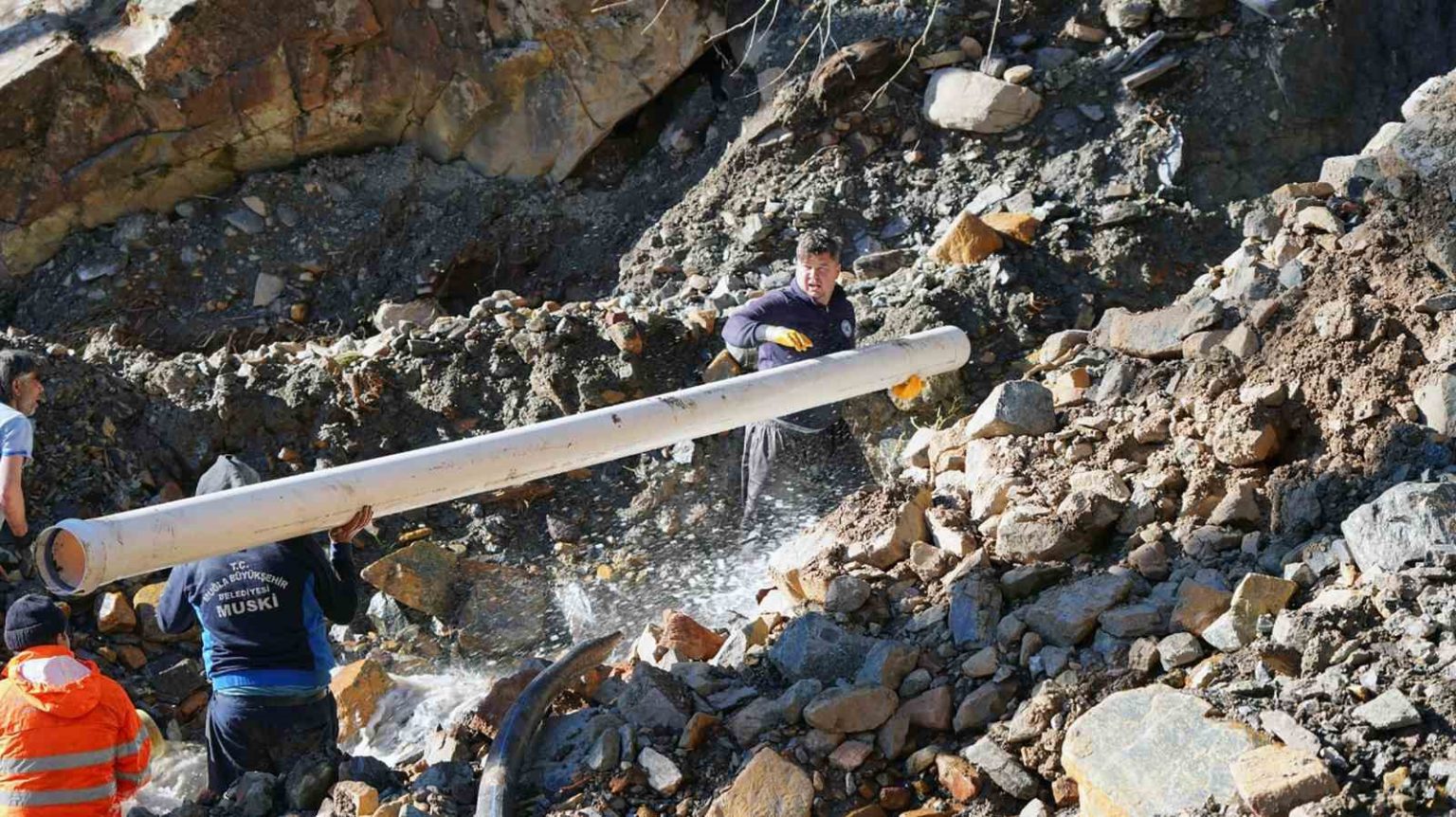Köyceğiz Pınar Mahallesi Muhtarı Ömer Ali Kanat, “Burası Beşparmak Dağı. Bizim içme suyumuzun olduğu kaynak burası. Kaynak bölgesindeyiz, en uçtayız, sarp arazi. Meydana gelen aşırı yağışlar ve afetten dolayı büyük bir göçük oluştu burada. Hemen akabinde de MUSKİ Genel Müdürlüğümüz ve Büyükşehirimiz hep beraber koordineli bir şekilde çalışmalara başladık burada. Burası gerçekten çalışması çok zor, sarp bir arazi. Çalışmamız bir haftadır aralıksız devam ediyor. Ben buradan özellikle üstün gayretlerinden dolayı MUSKİ çalışanlarımıza, MUSKİ Genel Müdürümüze, Ahmet Başkan’ımıza çok teşekkür ediyorum” dedi.