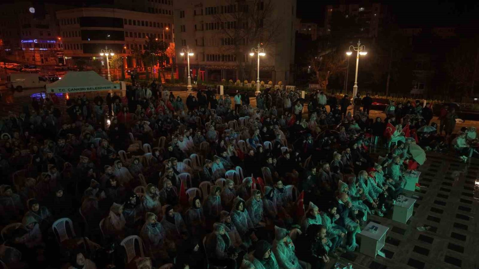 Çankırı’da vatandaşlar, A Milli Futbol Takımı’nın 2026 Dünya Kupası Avrupa elemeleri play-off finalinde Kosova’yı 1-0 mağlup ettiği maçı yağmur altında izledi.
