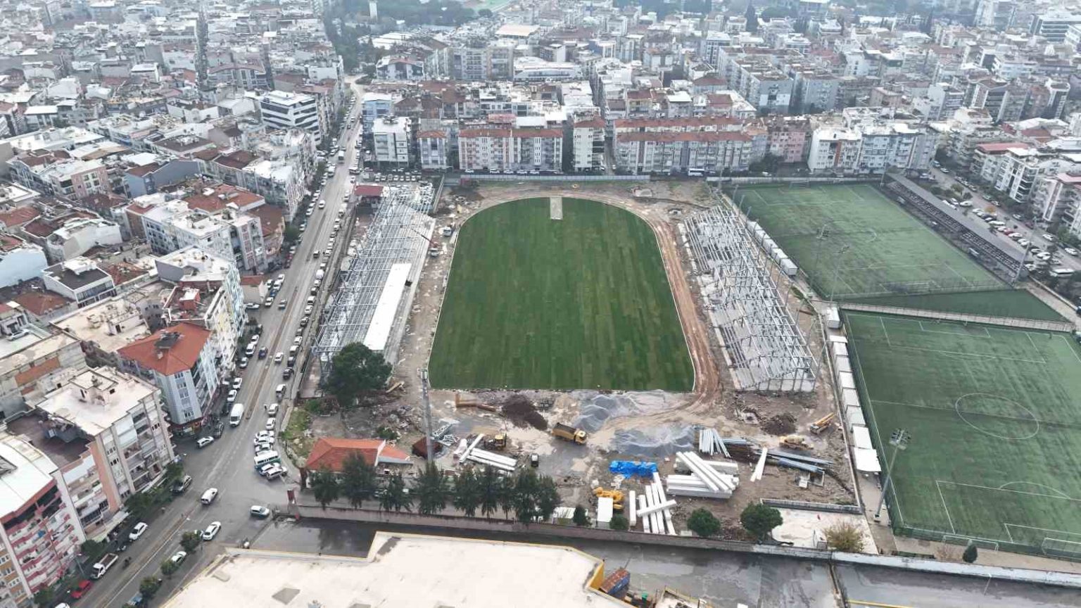Aydın’ın spor alanında simge yerlerinden olan ve bir dönem Aydınspor’un birinci lig maçlarına ev sahipliği yapan Adnan Menderes Stadyumu’nun, depreme dayanıksız olduğu gerekçesiyle yıkılmasının ardından yeni stadyum için başlatılan çalışmalar sürüyor. Sözleşme bedeli 202 milyon TL olan yeni stadyumun önümüzdeki aylarda tamamlanması beklenirken, stadyumda çelik tribünlerin büyük bölümü tamamlandı. Havadan son durumu görüntülenen yeni stadyumda FIFA standartlarındaki çimlerin seriminin yapıldığı görüldü.