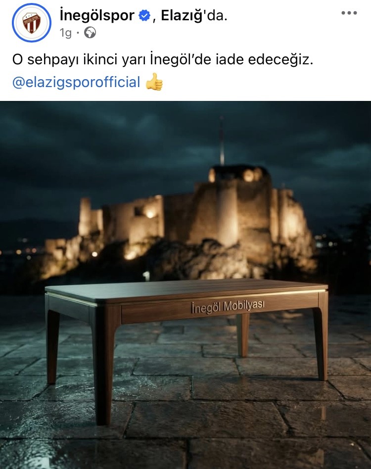 Elazığspor, Nesine 2. Lig Beyaz Grup’un 16. haftasında İnegölspor’u konuk etti. Maçta İnegölspor’un skoru 2-2’ye getirmesi sonucu protokol tribünde bazı olaylar yaşandı. Olaylar sonrası İnegölspor resmi sayfası üzerinden sehpa figürü paylaşarak imalı bir paylaşım yaptı. Elazığspor kulübü de resmi sayfası üzerinden bir açıklama yayımlayarak olaya ilişkin detayları paylaştı.