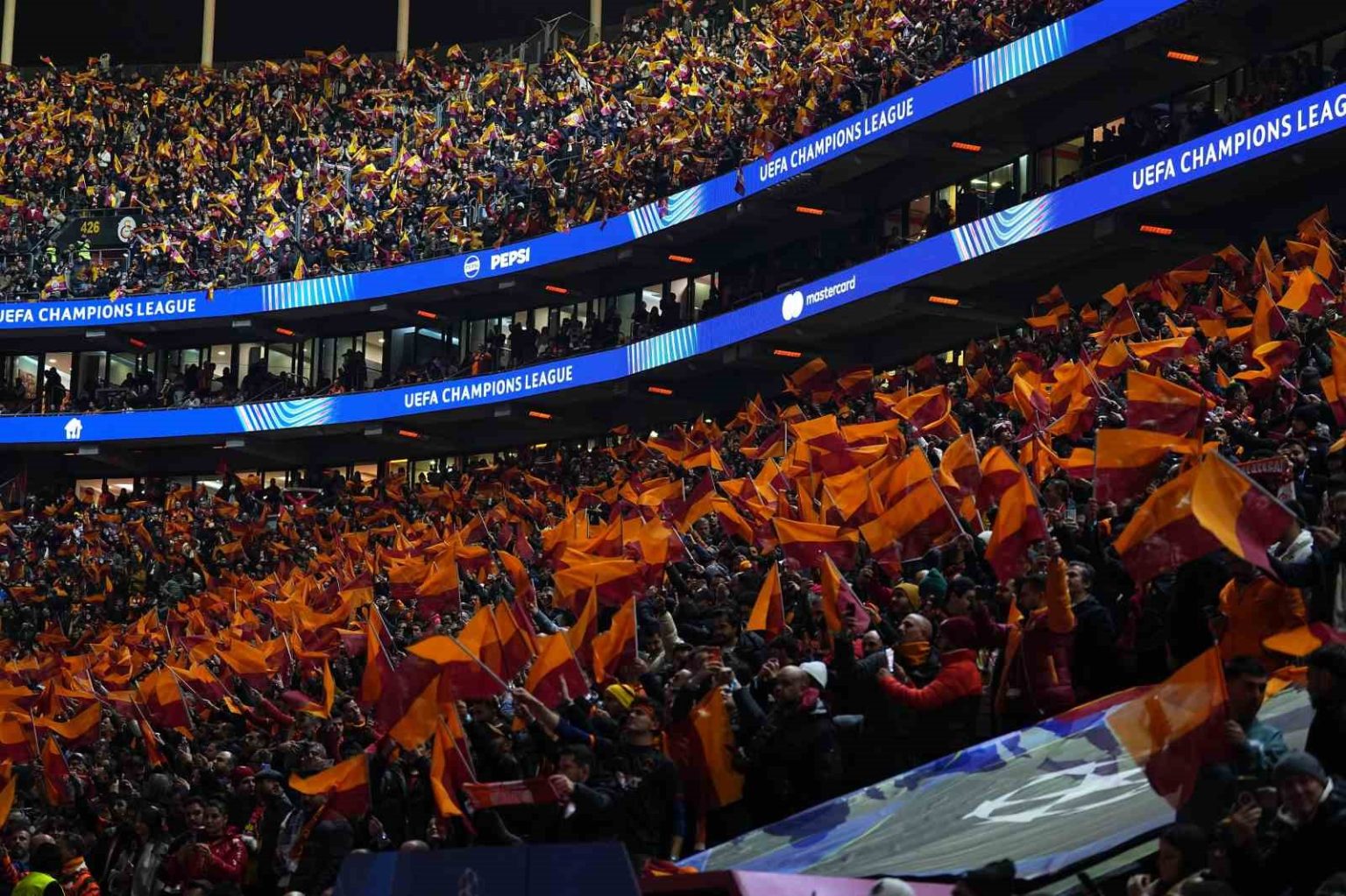 Galatasaray yönetimi, Atletico Madrid maçı için RAMS Park tribünlerine yaklaşık 50 bin sarı-kırmızılı bayrak bıraktı. Galatasaraylı taraftarlar, seremoni sırasında bayrakları sallayarak güzel bir atmosfer oluşturdu.