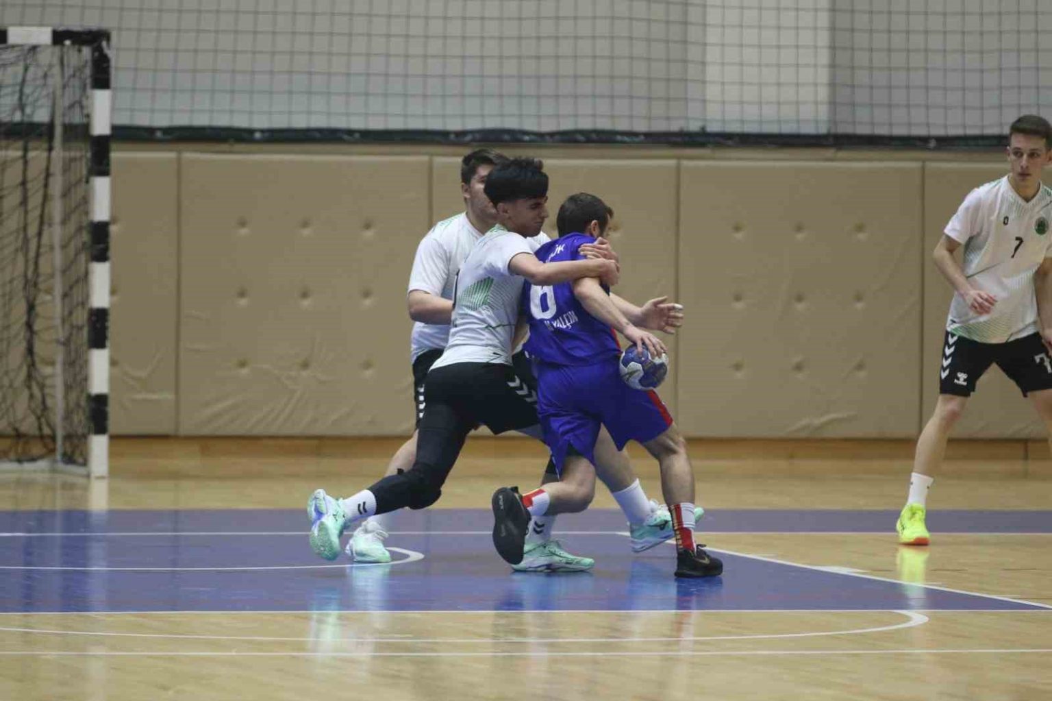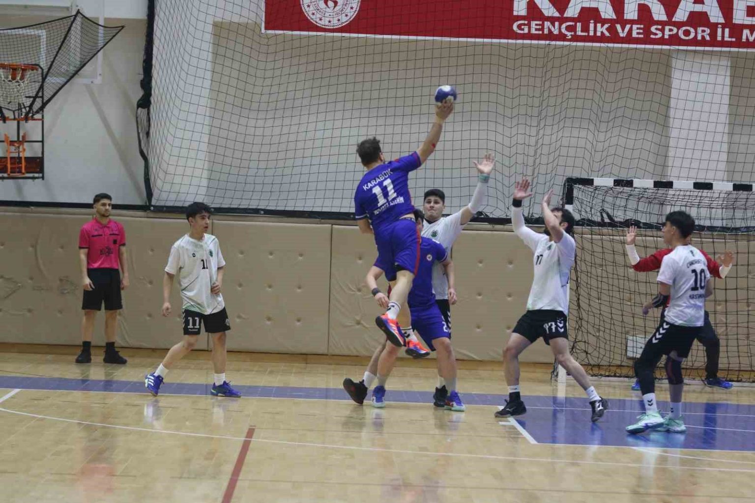 Karabük’te oynanan hentbol müsabakasında oyuncu hakeme saldırmaya çalıştı, kırmızı kartla oyundan atıldıktan sonra sahadan güçlükle çıkarıldı.