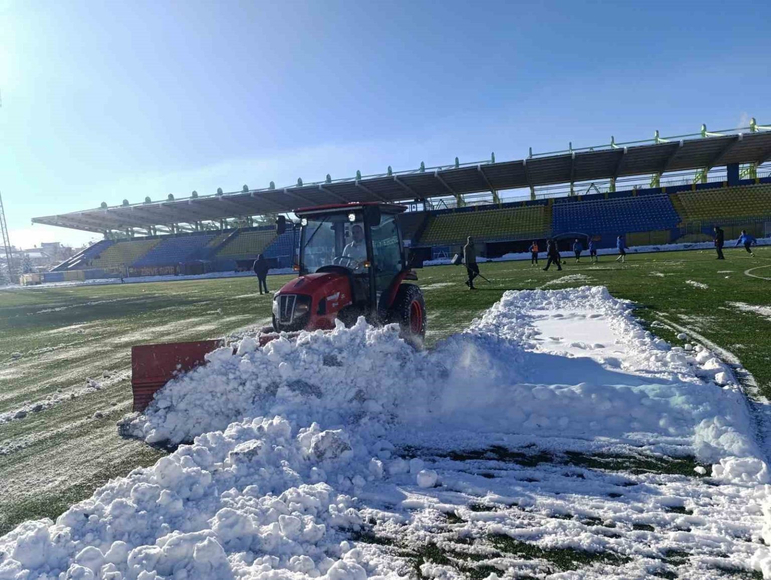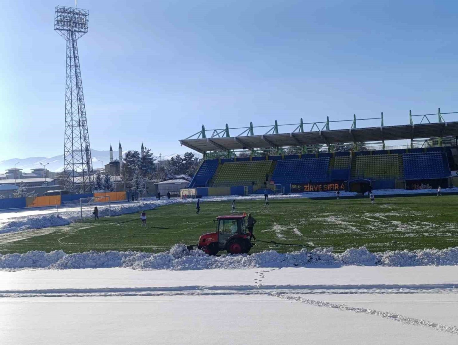 Ağrı’da dünden itibaren etkili olan kar yağışı nedeniyle Vali Lütfü Yiğenoğlu Stadı karla kaplandı. Maçın oynanabilmesi için Gençlik ve Spor İl Müdürlüğü Spor Hizmetleri Müdürü Cemil Budak koordinesinde sabah erken saatlerde başlatılan çalışmalarla saha zemnindeki kar kütlesi temizlendi. Yaklaşık 3 saat gecikmeli başlayan karşılaşma, olumsuz hava şartlarına rağmen oynandı.
