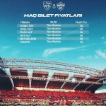 “Kuzey Üst tribün: 38 TL, Doğu Üst tribün: 38 TL, Doğu Alt tribün: 38 TL, Batı Alt tribün: 38 TL, Batı Balkon tribün: 38 TL, Misafir tribün: 49 TL.”