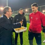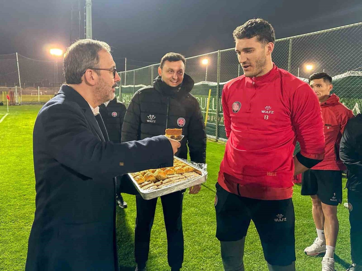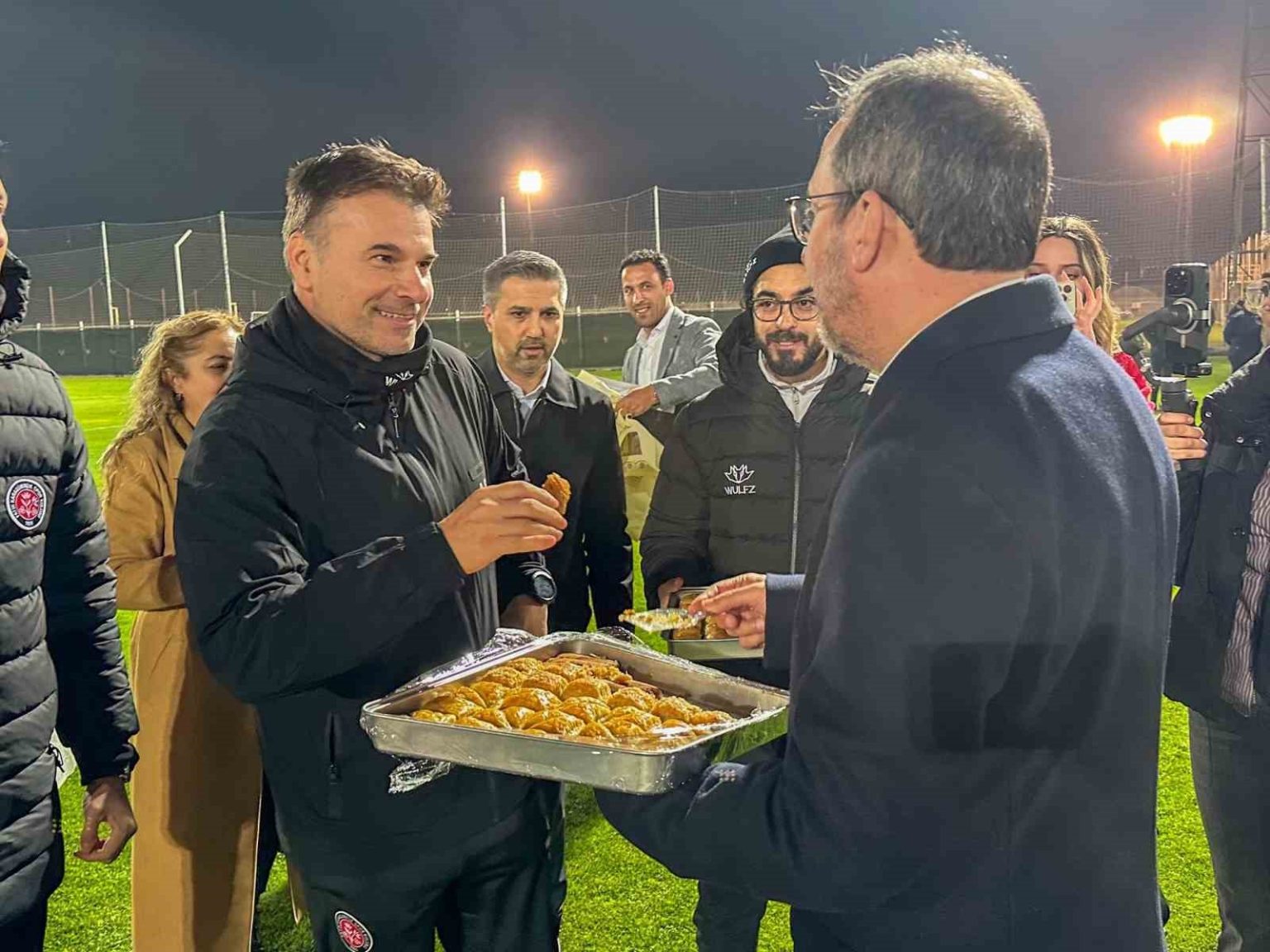 Akşam antrenmanında teknik direktör Aleksandar Stanojevic ve oyuncularla sohbet eden Kasapoğlu, takıma baklava ikram etti.