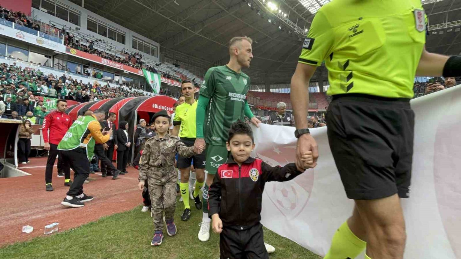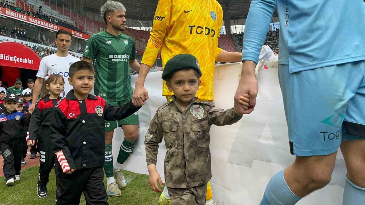 Eskişehir’de oynanan Ankara Demirspor-Bursaspor maçında Polis Haftası kapsamında üniforma ile sahaya çıkan minik taraftarlar ilgi odağı oldu.