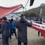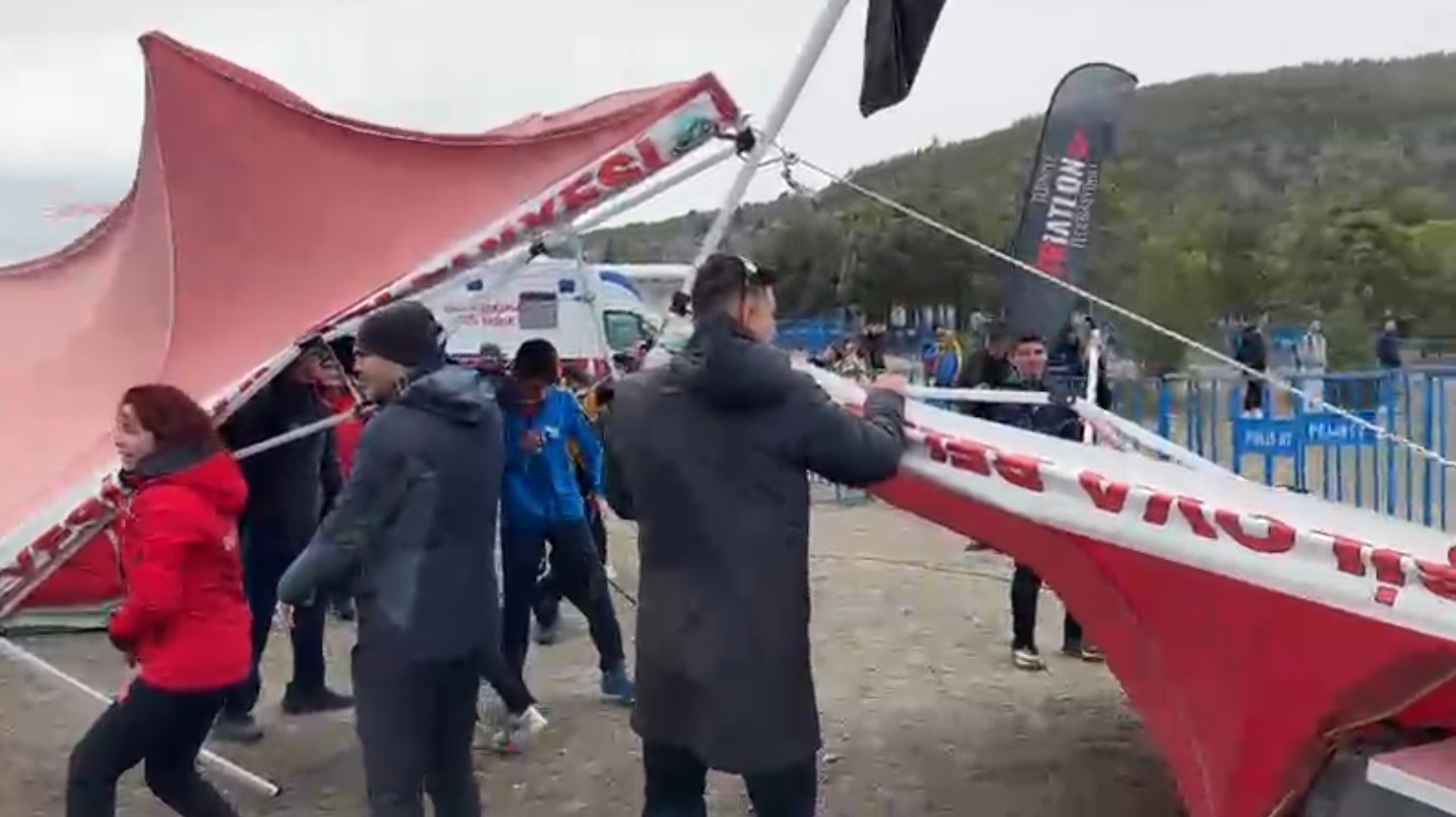 Burdur’un Yeşilova ilçesinde bulunan Salda Gölü’nde yapılan Salda Duatlonu Türkiye Kupası’na şiddetli rüzgar sahne oldu. Rüzgar nedeniyle çadırlar ve demir bariyerle uçarken sporcular zor anlar yaşadı.