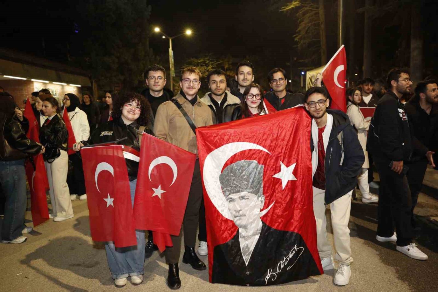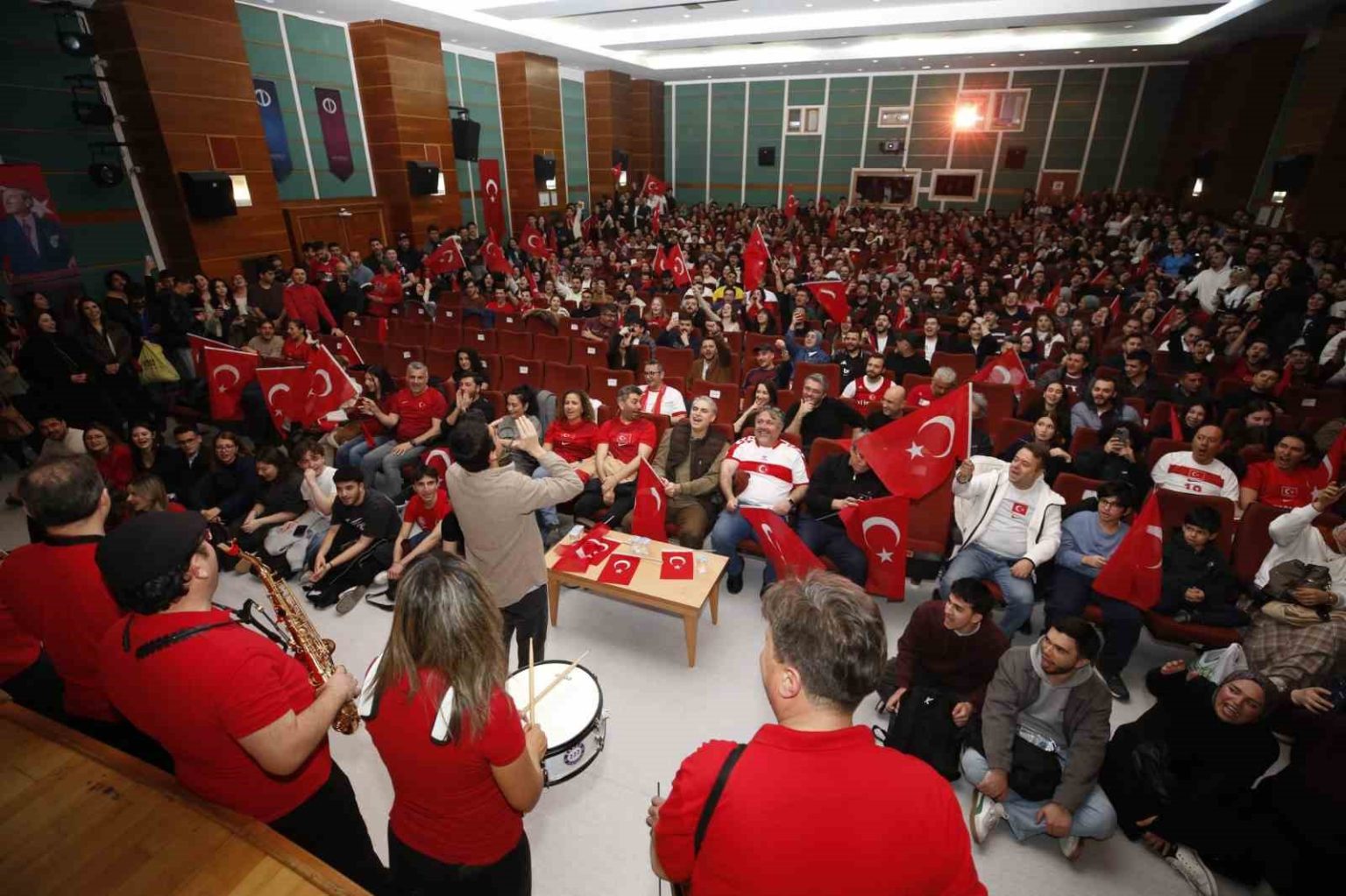 Sinema Anadolu’yu hınca hınç dolduran öğrenci ve akademisyenler, ay-yıldızlı ekibin Kosova karşısındaki galibiyetine oturacak koltuk kalmayınca yerde ortak oldu. 24 yıldır Dünya Kupası’na katılamayan Türkiye’nin, Kosova’yı 1-0 mağlup ettiği tarihi müsabaka, Eskişehir Anadolu Üniversitesi Sinema Anadolu’da kurulan dev ekranda takip edildi. Salonun kapasitesinin yetersiz kaldığı gecede, çok sayıda futbolsever maçı ayakta ve yerlere oturarak izlemek zorunda kaldı. Coşkunun bir an olsun dinmediği salonda bando takımı, İzmir Marşı ve İstiklal Marşı ile taraftarların heyecanına ortak oldu.