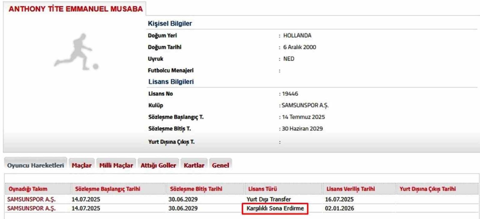 Trendyol Süper Lig ekiplerinden Samsunspor’da ara transfer döneminin açılmasıyla birlikte ilk ayrılık gerçekleşti. Sözleşmesinde 5 milyon euro serbest kalma maddesi bulunan Demokratik Kongo asıllı Hollandalı kanat oyuncusu Anthony Musaba’nın sözleşmesinin feshedildiği, gece saatlerinde Türkiye Futbol Federasyonu’na iletildi. Böylece yeni yılda Samsunspor kadrosundan ayrılan ilk isim Musaba oldu.