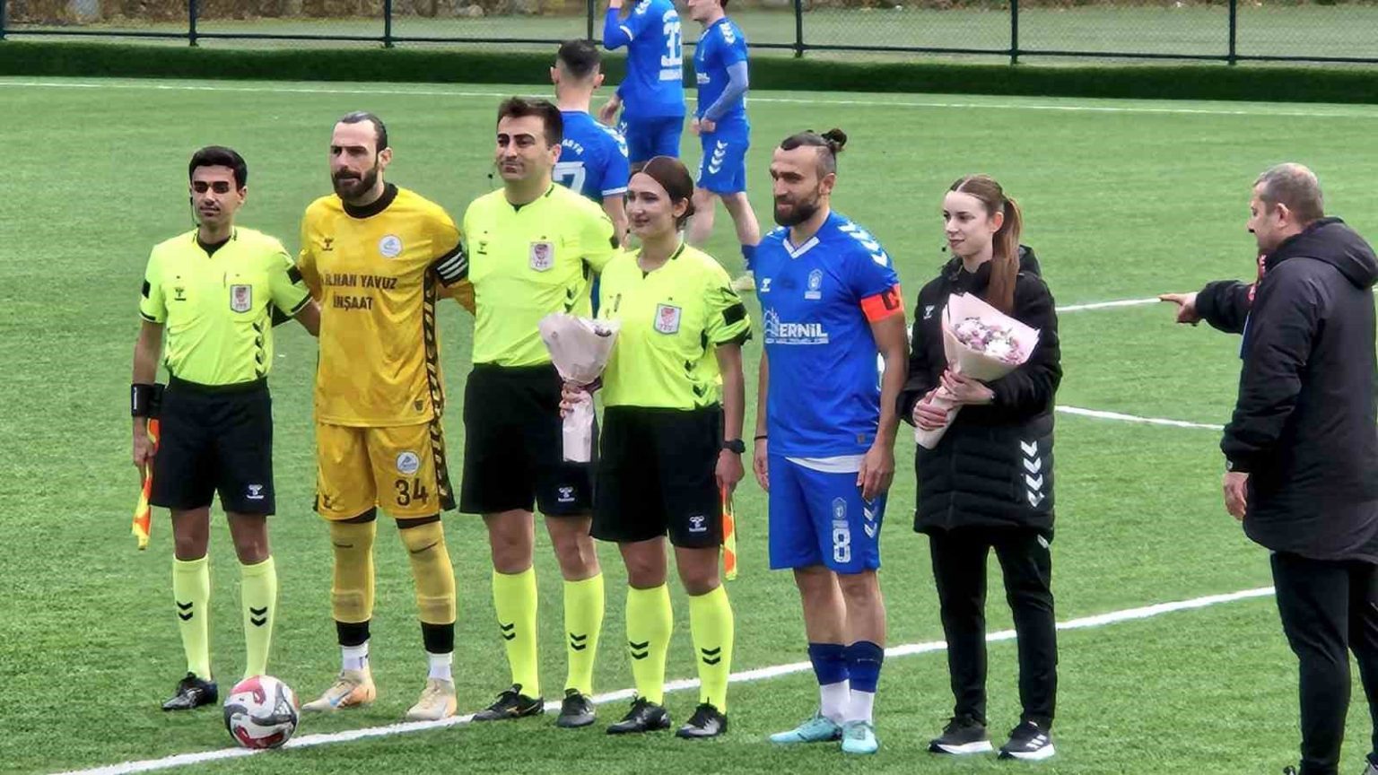 Trabzon’da 8 Mart Dünya Kadınlar Günü dolayısıyla oynanan Maçka Belediyespor-Ortahisar FK karşılaşması öncesinde kadın hakemlere çiçek takdim edildi.