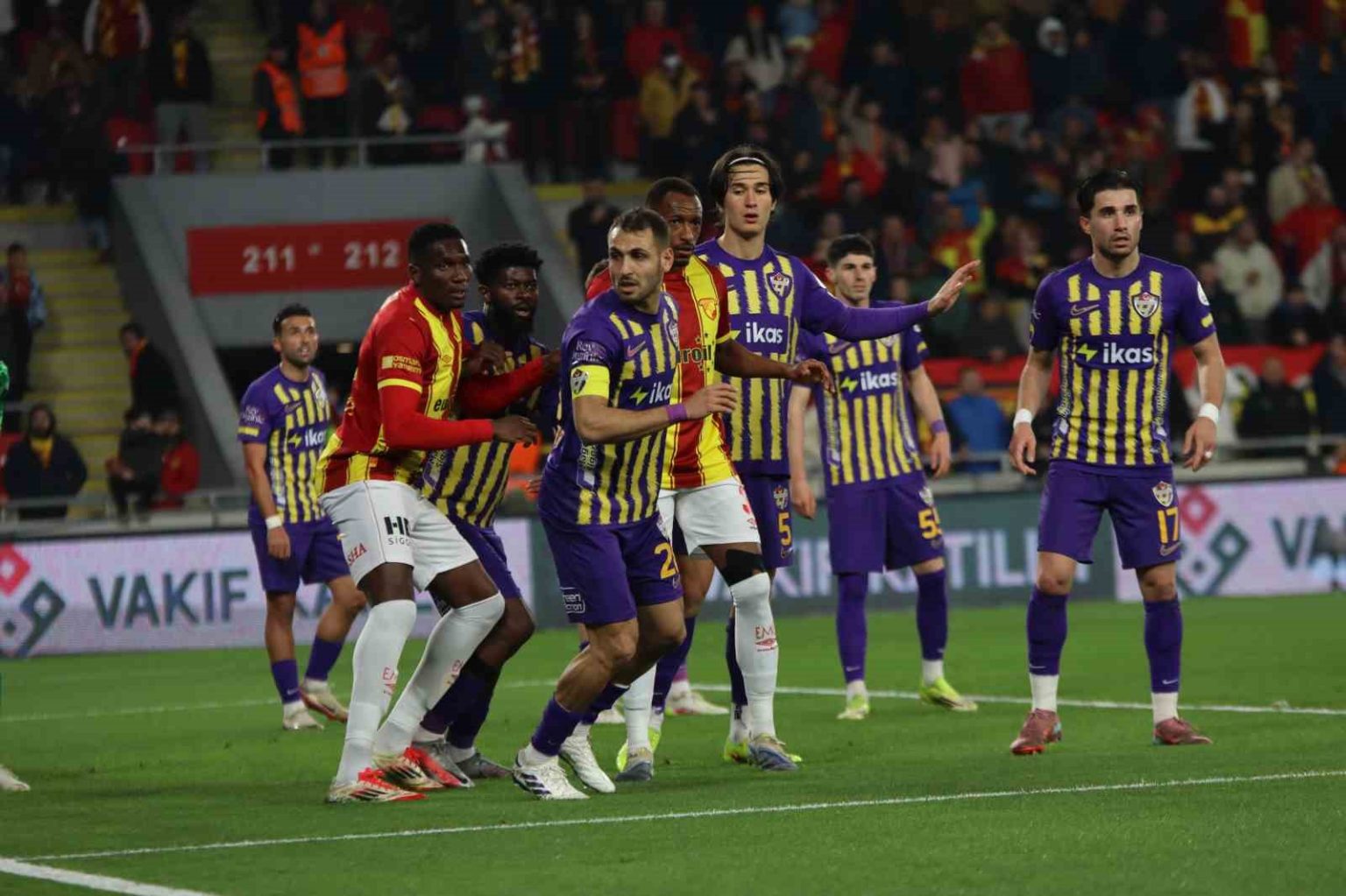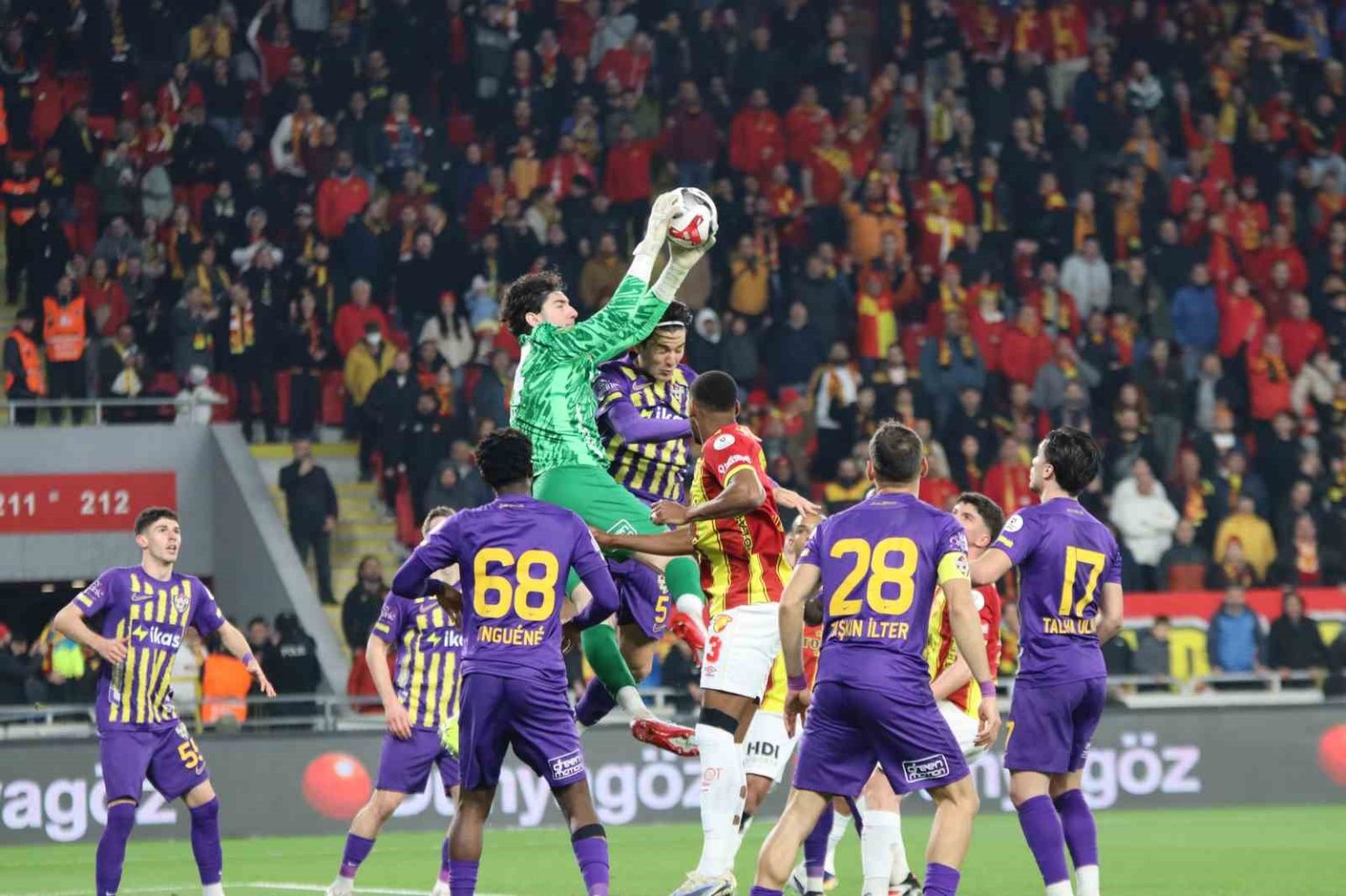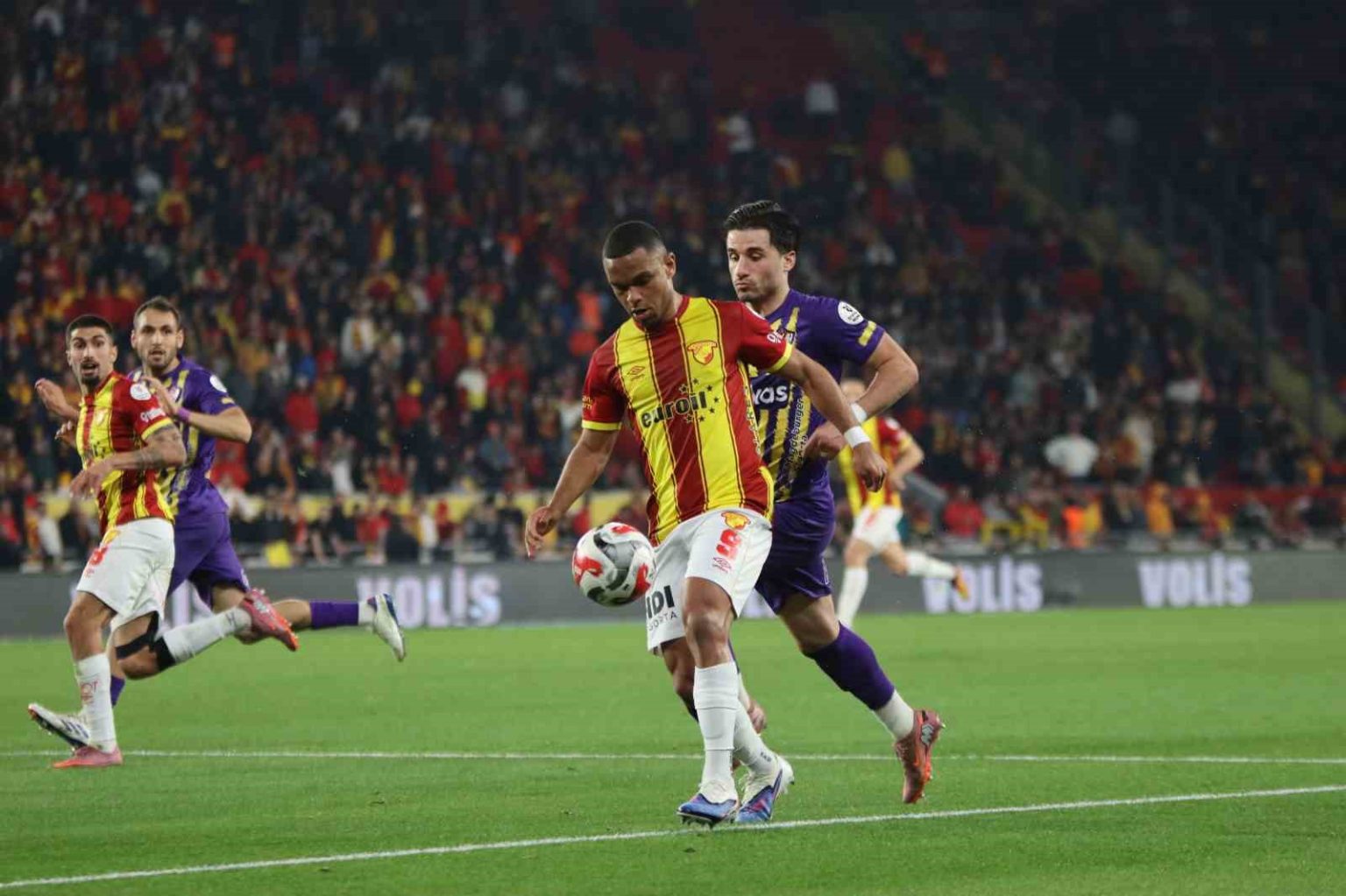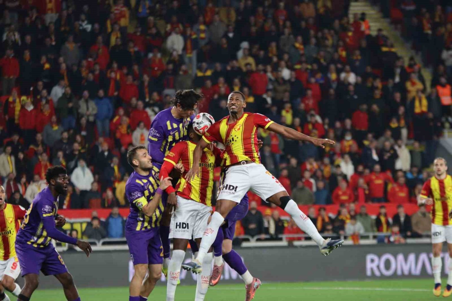 4. dakikada sol kanattan Juan’ın kafa vuruşu sonrası Janderson’un şutunda top Onguene’den döndü. Sarı-kırmızılı futbolcular penaltı itirazında bulundu.