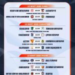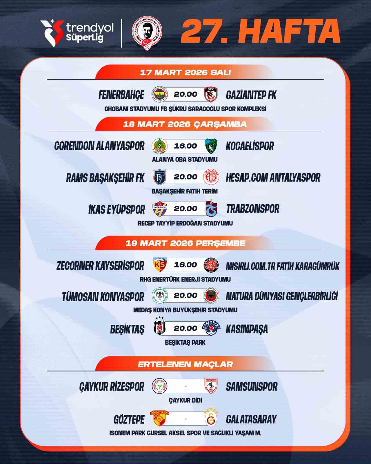 Türkiye Futbol Federasyonu (TFF), Süper Lig’de 26-27. hafta maçlarına ilişkin programı duyurdu. Galatasaray ve Samsunspor’un UEFA Şampiyonlar Ligi ve UEFA Konferans Ligi’nde son 16 turuna yükselmiş olmalarından dolayı, Göztepe – Galatasaray ile Çaykur Rizespor – Samsunspor mücadeleleri ileri bir tarihe ertelendi. Karşılaşmaların oynanacağı tarihler daha sonra ilan edilecektir.
