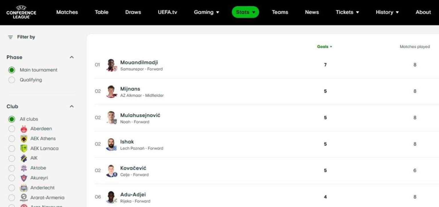 Kuzey Makedonya ekibi Shkendija’yı eleyerek Konferans Ligi’nde son 16 takım arasına adını yazdıran Samsunspor, bireysel performanslar ile de öne çıkıyor. Samsun ekibinde 8 maçta 7 gol atan Marius Mouandilmadji, en yakın rakibinin 2 gol önünde gol krallığında zirvede yer alıyor. Dün Shkendija filelerini de 2 kez sarsan Mouandilmadji’nin en yakın takipçileri ise 5’er golle AZ Alkmaar’dan Sven Mijnans, Noah’tan Nardin Mulahusejnovic, Lech Poznan’dan Mikael Ishak ve Ferencvaros’tan Franko Kovacevic.