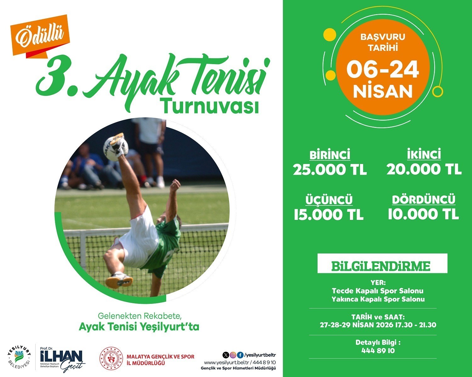 Yeşilyurt Belediyesi Gençlik ve Spor Hizmetleri Müdürlüğü, gençleri spora teşvik etmek, birlik ve dayanışma duygularını güçlendirmek amacıyla bu yıl üçüncüsünü düzenleyeceği Ödüllü 3.Ayak Tenisi Turnuvası için hazırlıklarını tamamladı. Sporun rekabetçi ruhunu dostlukla buluşturacak organizasyon, Yeşilyurt’ta büyük bir heyecana sahne olacak.